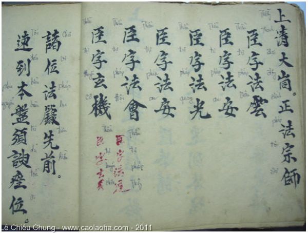 Cụ Lê Chiêu Châm thuộc chi 4 đời thứ 10 của họ Lê Chiêu được phong pháp hiệu là Thần tự Pháp Quang, cụ truyền lại cho con cháu đời sau là cụ Lê Chiêu Kim đời thứ 11 pháp hiệu Thần tự Pháp An (Trùng với pháp hiệu của ông ngoại), đời thứ 12 có cụ Lê Chiêu Hoành pháp hiệu Thần tự Pháp Hội, cụ Lê Chiêu Nỷ pháp hiệu Thần tự Pháp Mãi, đời thứ 13 có cụ Lê Chiêu Phường pháp hiệu Thần tự Huyền Cơ, cụ Lê Chiêu Quyền pháp hiệu thần tự Pháp Thông, cụ Lê Chiêu Thừa pháp hiệu Thần tự Huyền Thành, đời thứ 14 có cụ Lê Chiêu Bá pháp hiệu Thần tự Huyền Chơn, cụ Lê Chiêu Tùng, Lê Chiêu Ngoách, Lê Chiêu Chiên, Lê Chiêu Hân lấy chung pháp hiệu Thần tự Đào Lưu, cụ Lê Chiêu Tuynh pháp hiệu Thần tự Huyền Diện, cụ Lê Chiêu Khinh pháp hiệu Thần tự Pháp Thống. Việc phong pháp hiệu rất tốn kém, cúng liên tục 3 ngày 3 đêm, lễ vật bày cúng từ trong nhà ra ngoài ngõ và thực hiện rất nhiều lễ tế trời đất, sư môn, sư tổ trước sự chứng giám của huynh đệ đồng môn và chức sắc chính quyền. Hiện nay các cụ có pháp hiệu đều đã mất, từ đời 15 trở đi con cháu không phong pháp hiệu nên không còn ai có pháp hiệu nữa.