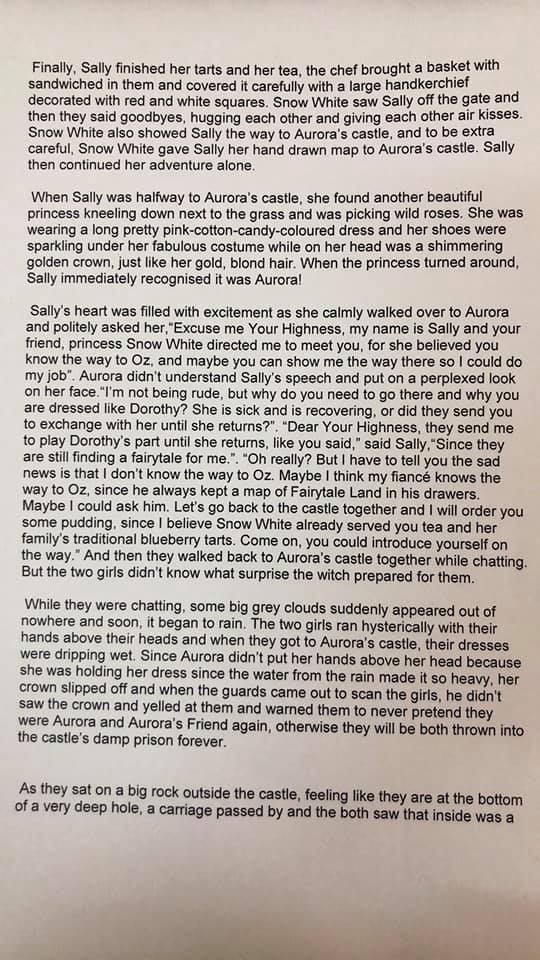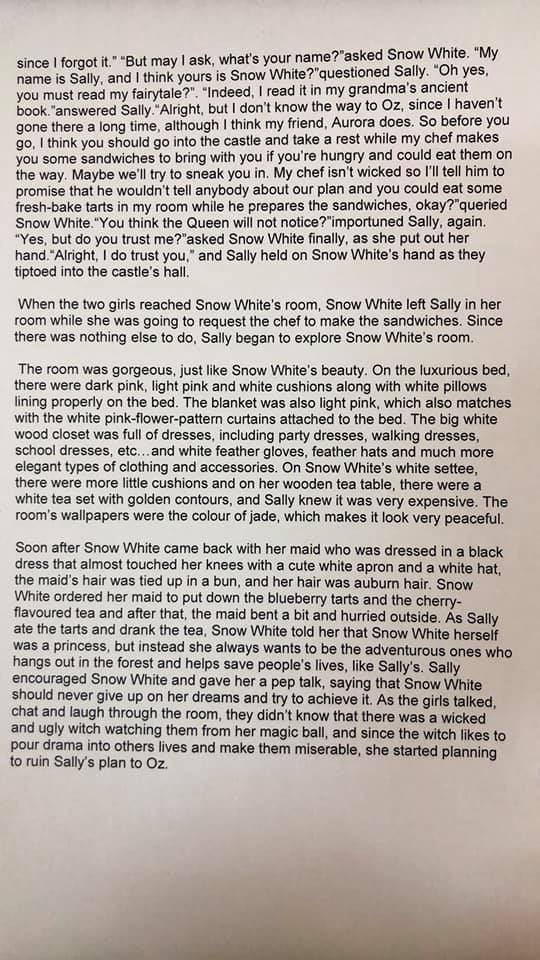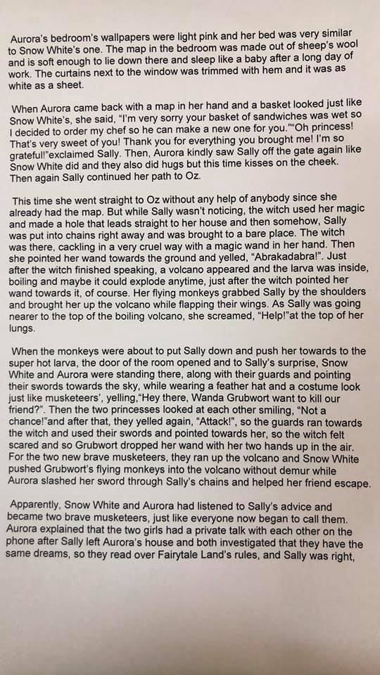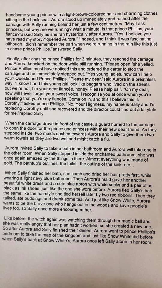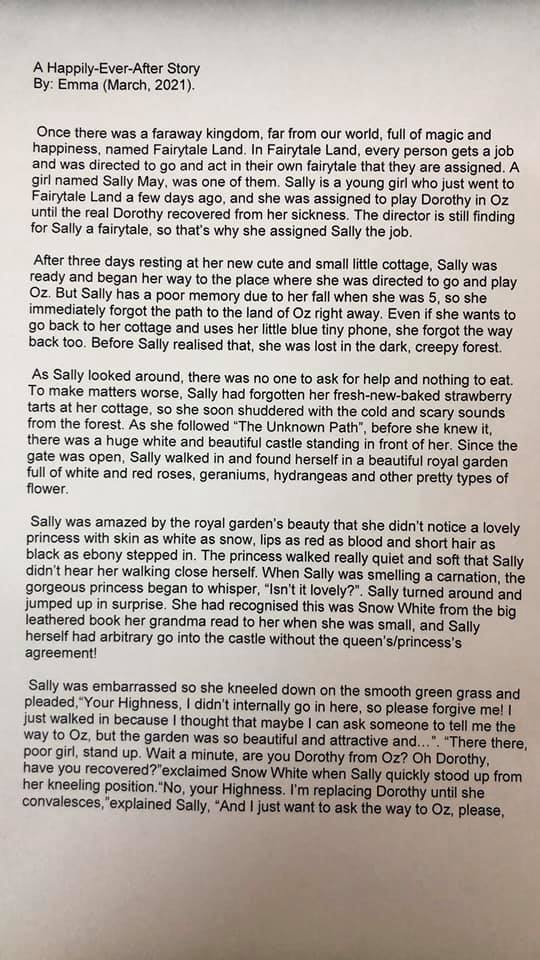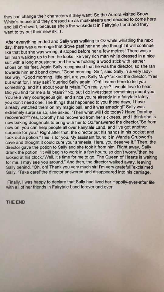Cuối cùng cô bé và các bạn đã chiến thắng kẻ ác, và sự tưởng thưởng xứng đáng cho cô bé là liều thuốc tiên giúp cô thoát khỏi căn bệnh mất trí nhớ để cô mãi được sống hạnh phúc bên các bạn của mình. Giống như một bộ phim thần thoại có những nhân vật cổ điển nhưng không quá xa rời hiện thực. Tất cả là do con tự tưởng tượng ra, vì con nói con thích nghĩ ra vấn đề và giải quyết chúng. Con có ước mơ trở thành đạo diễn phim điện ảnh sau này, nên con muốn viết kịch bản của mình để tự làm phim.