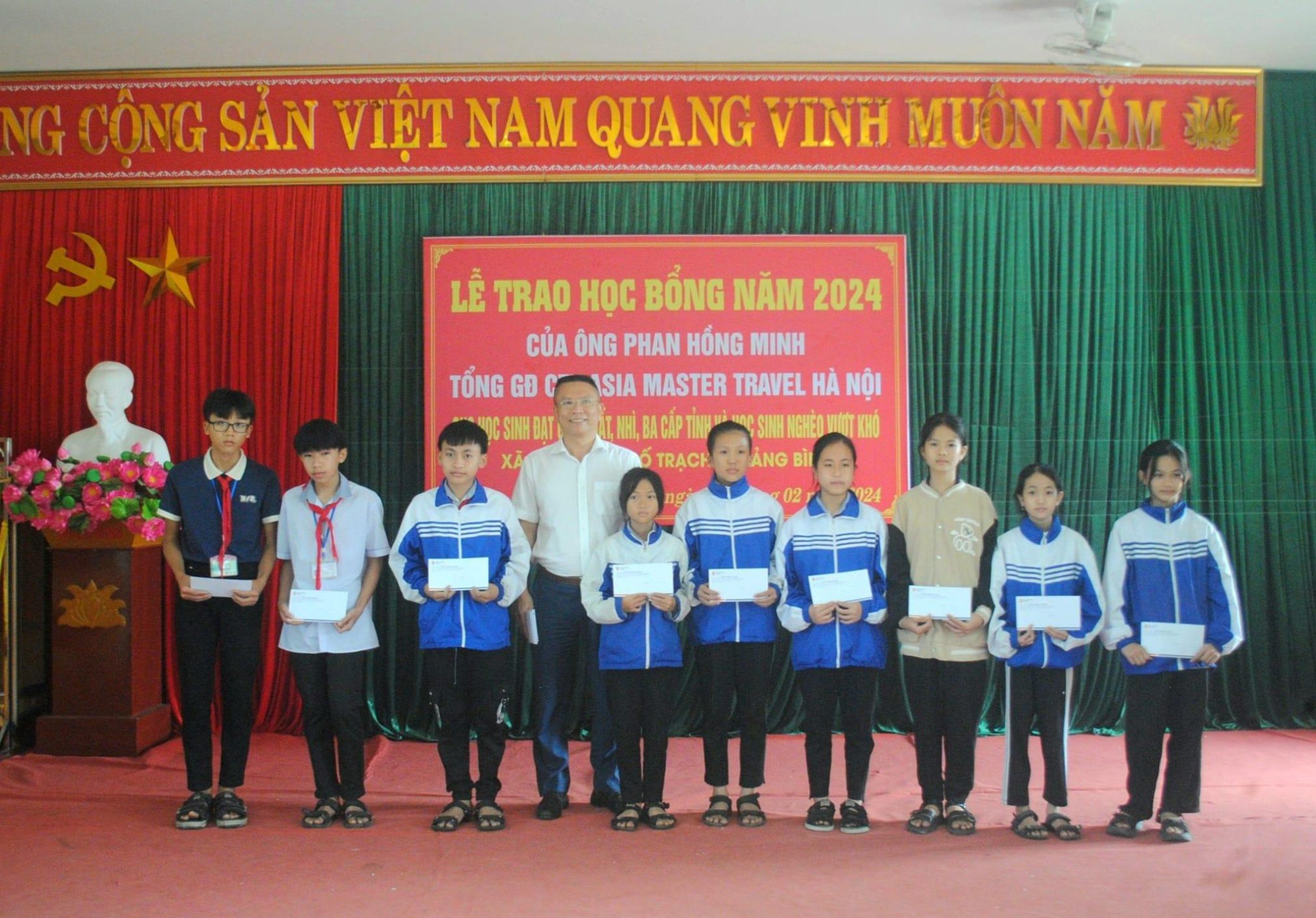 Ngày 24/2/2024, trong chuyến về quê nhân dịp Rằm tháng Giêng, anh đã trao tặng 30 suất học bổng cho 4 học sinh Trường THCS Lưu Trọng Lư đạt giải Nhất, Nhì, Ba trong kỳ thi cấp tỉnh vừa qua và 26 cháu học sinh thuộc diện hoàn cảnh khó khăn, mỗi suất 500.000 đồng. Tổng số tiền là 15 triệu đồng. Đây là những phần thưởng vô cùng ý nghĩa, nâng bước học sinh đến trường, là động lực giúp các em vượt khó, vươn lên.
