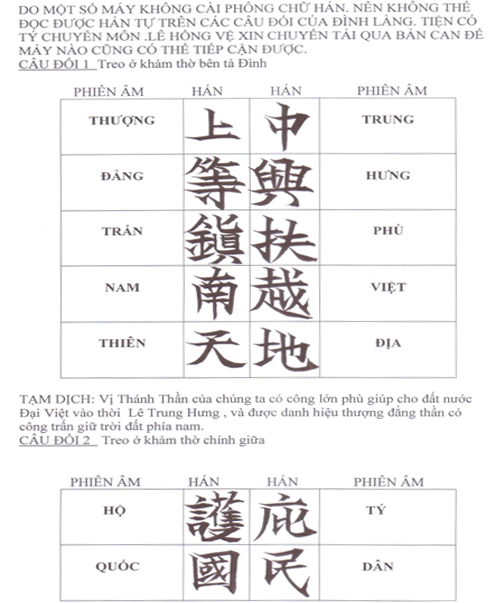 Ba đôi câu đối dự định sẽ treo hai bên 3 khảm thờ trong Hậu chẩm Đình làng Cao Lao Hạ do anh Lê Đức Phú và anh Lê Chiêu Chung sưu tầm,̀ đã được các ông Trương Quang Phúc, Chủ tịch Hội Hán Nôm Quảng Bình và ông Thổ cùng̀ các ông biết chữ Hán trong Làng hiệu chỉnh cho phù hợp với Đình Làng ta. Anh Lê Hồng Vệ, họa sỹ, người chuyên nghiên cứu về các sắc phong, rất giỏi chữ Hán đã giải nghiã thêm nội dung các câu đối để bà con khi về Đình làng hiểu cặn kẽ hơn.