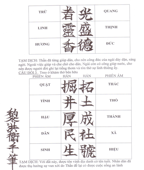 Câu này treo ở khảm thờ bên hữu, phía Đông Nam. Có ý nói lên công lao của các bậc thủy tổ, thần hoàng làng về việc khai thác đất đai, lập tên làng, tìm nguồn nước cho dân làm ăn sinh sống