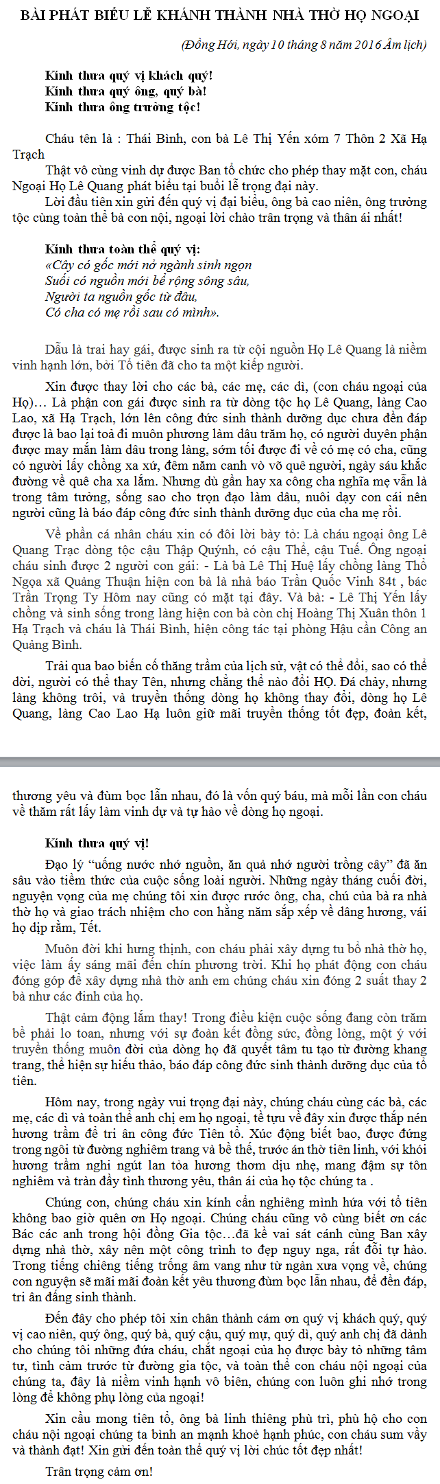 Bài phát biểu lễ khánh thành nhà thờ họ Lê Quang08:30 - 25/09/2016Bài phát biểu tại buổi lễ khánh thành nhà thờ họ ngoại của anh Nguyễn Thái Bình .Tác giả: Nguyễn Thái BìnhChia sẻ: