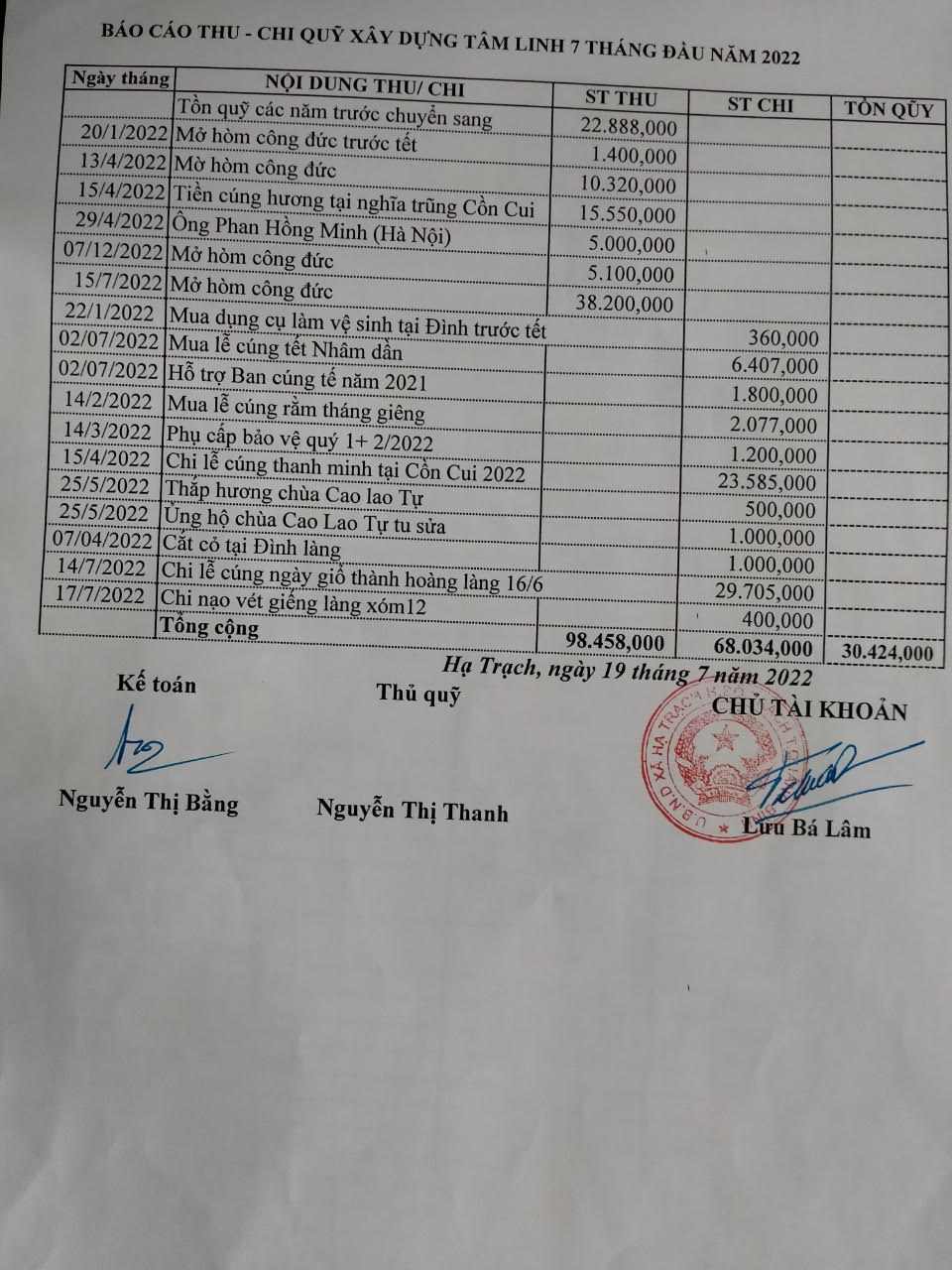 Báo cáo hoạt động thu chi cúng tế địa phương01:35 - 04/08/2022 Báo cáo thu chi 7 tháng đầu năm 2022 của hoạt động cúng tế tại truyền thống của xã Hạ trạch Tác giả: Lưu Bá LâmChia sẻ: