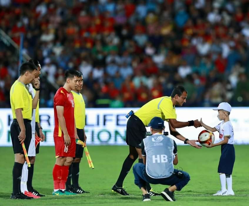 Nhận quả bóng từ tay cậu bé, vị trọng tài của trận đấu nở nụ cười khích lệ.