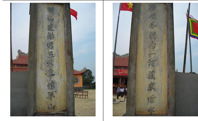 - Câu thứ tư tại hai mặt phía hàng rào nhưng nay không còn, theo Cao Lao địa chí của cụ Lê Văn Sơn chép lại: “Hương tích vạn thiên niên quan yên dân lạc. Lý thành nhị thập ấp mỹ tục thuần phong”. Xin thể hiện chữ Hán như sau: