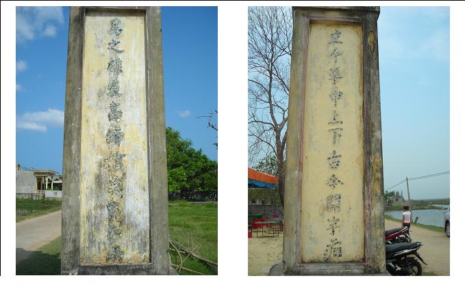 Trong câu chữ hán nhất là các câu đối ngoài nghĩa đen còn có nghĩa bóng, có câu chữ nghĩa rõ ràng nhưng phải hiểu nghĩa khác, phải luận theo ngữ cảnh, hiểu sâu xa mới thấy được sự tinh tuý của chữ hán và sự thâm thuý của người dùng chữ “Nói vậy nhưng không phải vậy”. Đọc chữ hán khảm sành sứ trên cột biểu Đình làng đã khó rồi nhưng luận rõ ý càng khó hơn. Với chút kiến thức của mình, tôi xin thể hiện chữ các câu đối theo thứ tự và diễn nghĩa, có gì thiểu ý mong mọi người chỉ giáo.