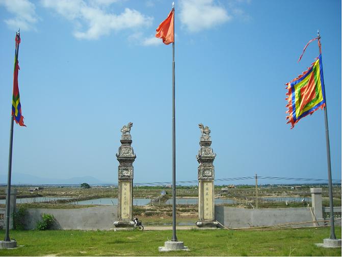 “Linh thủy ngoại triều” nghĩa là bờn ngoài nước thủy triều Linh Giang, “Nội nhất hà khờ” là bờn trong một con húi, “lai hoạt thủy” là nước về vào ra, “Hoành Sơn viễn” Hoành Sơn ở xa, “cung 供” là cung cấp (nếu không có bộ nhân đứng 亻là chữ cộng 共như nhiều người đọc), “cận tam sa phụ” gần 3 cồn cát lớn, “tác bình sơn” là tạo bình phong, “tác” có nghĩa là tạo nên, sáng tác, nếu đọc chữ túc là không đúng, chữ túc (sung túc) viết 足hoặc lưu lại, tá túc viết 宿không phải chữ trên cột Đình “sa” cát, cồn cát, phù sa, “phụ” là gò, động, cồn cũng có nghĩa to lớn.