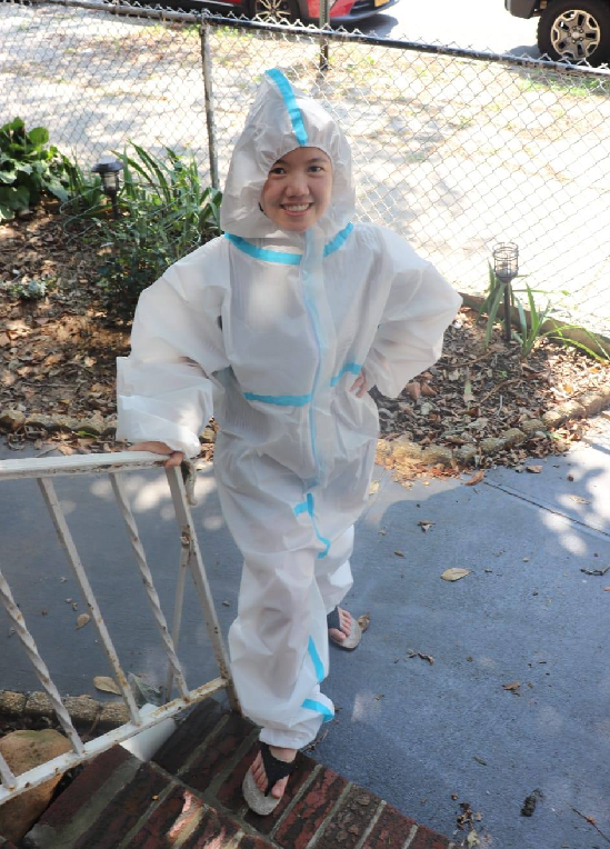 Bác sĩ Lê Na mặc đồ bảo hộ ra sân bay đi NewYork để thực tập. Ảnh: Bác sĩ cung cấp