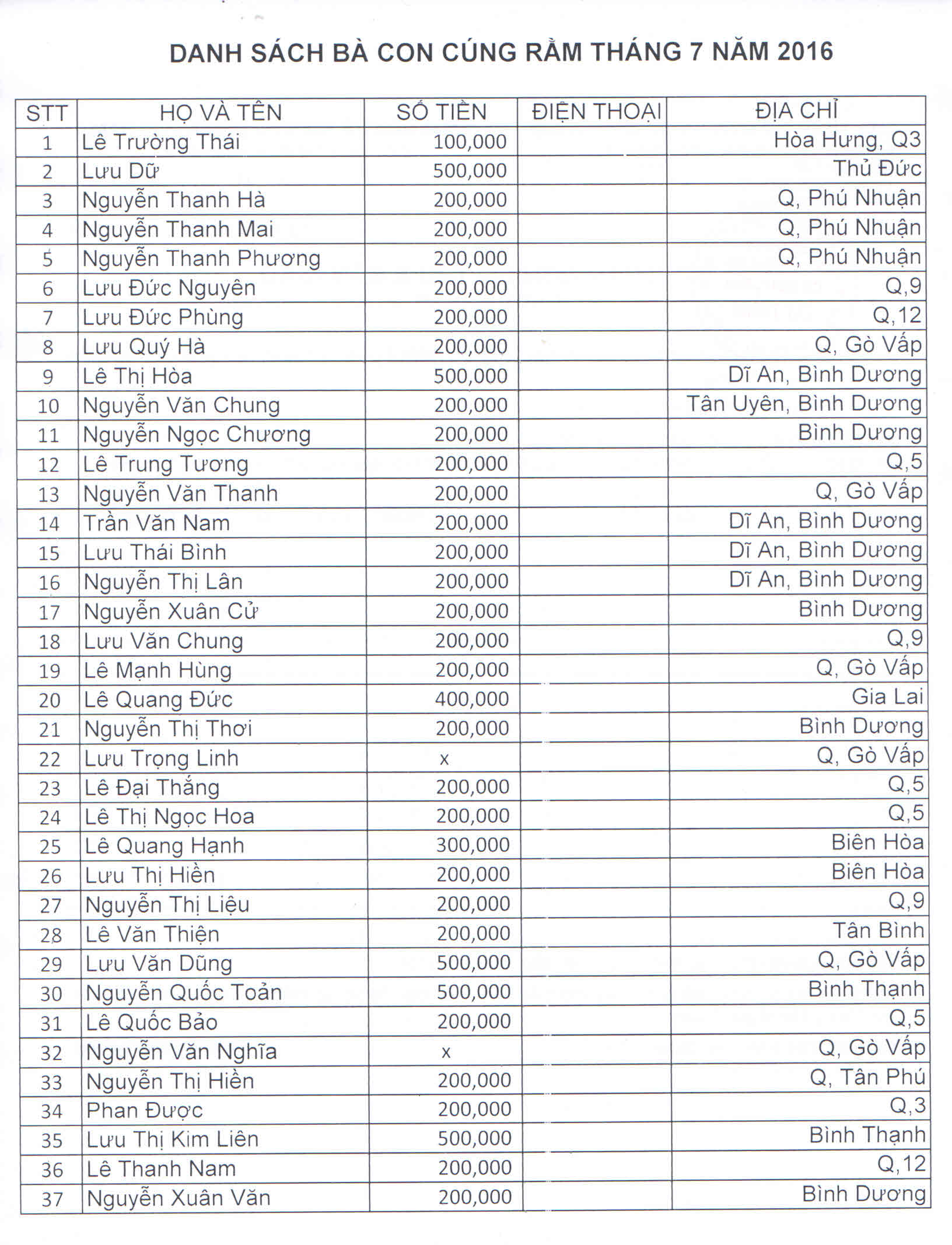 Bà con cúng rằm tháng 7 năm 2016 tại chùa Cao Lao Tự16:00 - 30/08/2016Danh sách bà con cúng rằm tháng 7 năm 2016 tại chùa Cao Lao Tự .Tác giả: Lê Mạnh HùngChia sẻ: