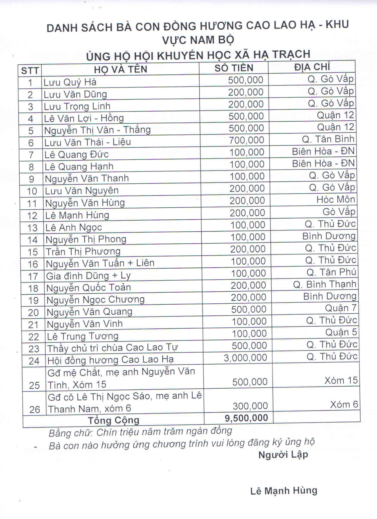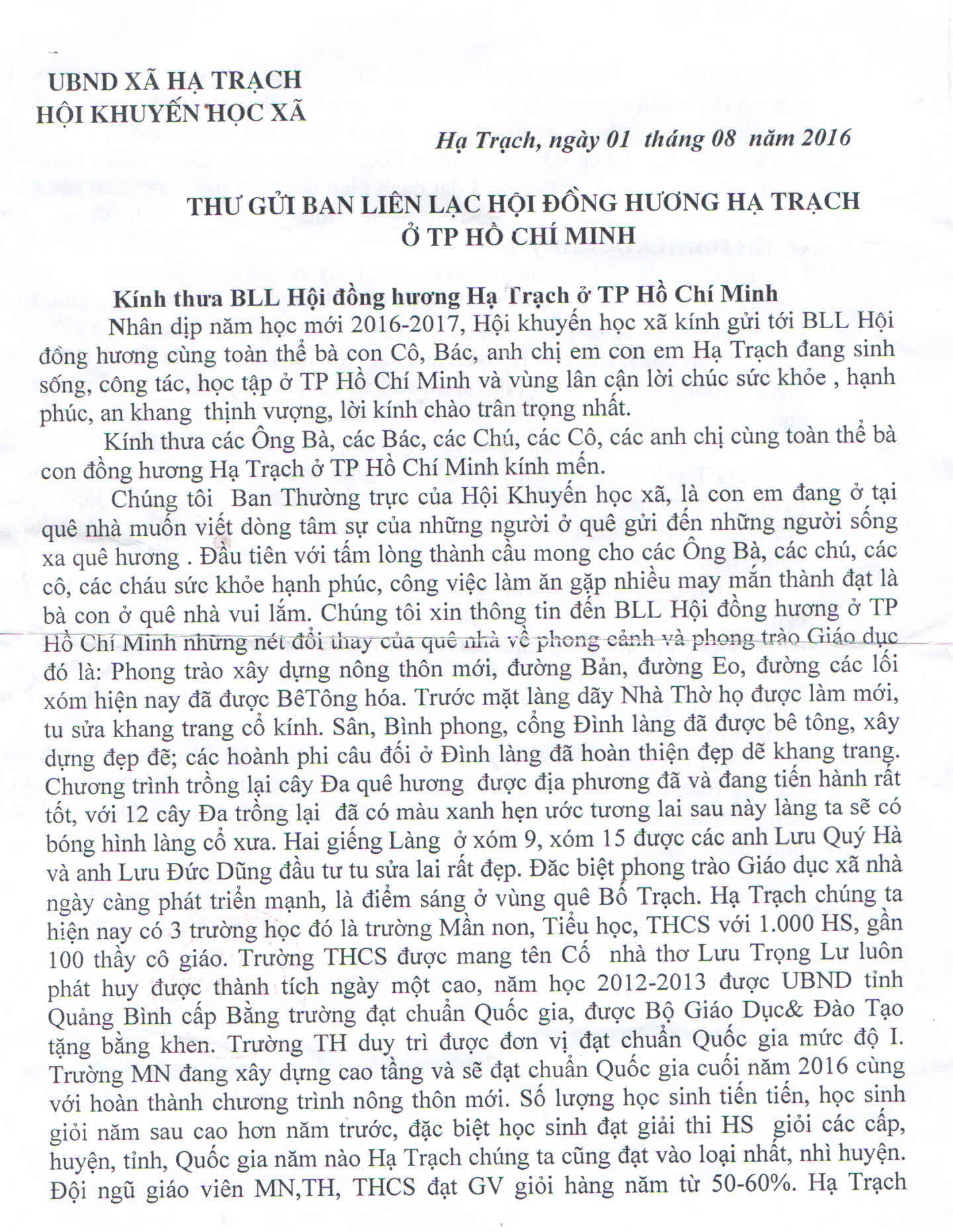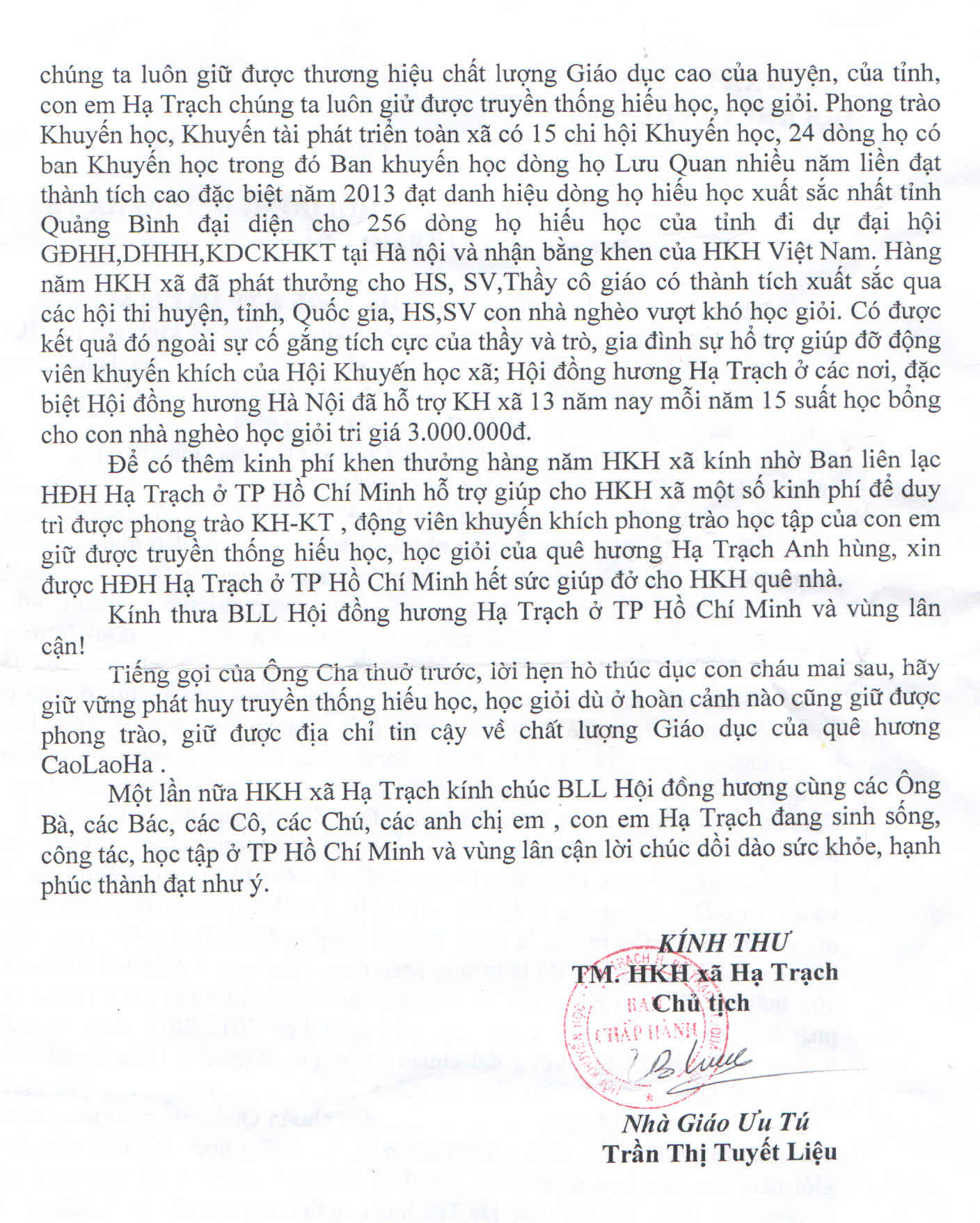 Bà con Cao Lao Hạ tại Nam Bộ ủng hộ Hội Khuyến học xã22:54 - 26/08/2016Danh sách bà con đồng hương Cao Lao Hạ tại Nam Bộ ủng hộ Hội Khuyến học xã Hạ Trạch .Tác giả: Lê Mạnh HùngChia sẻ: