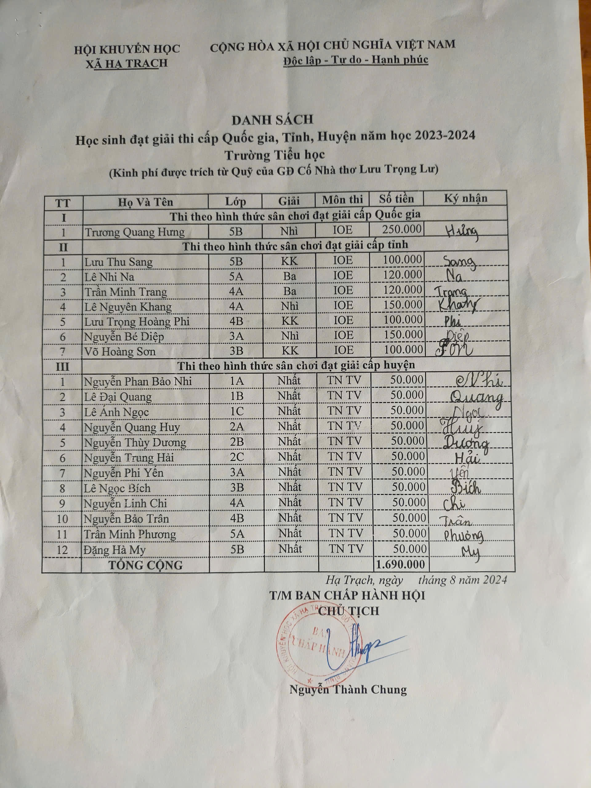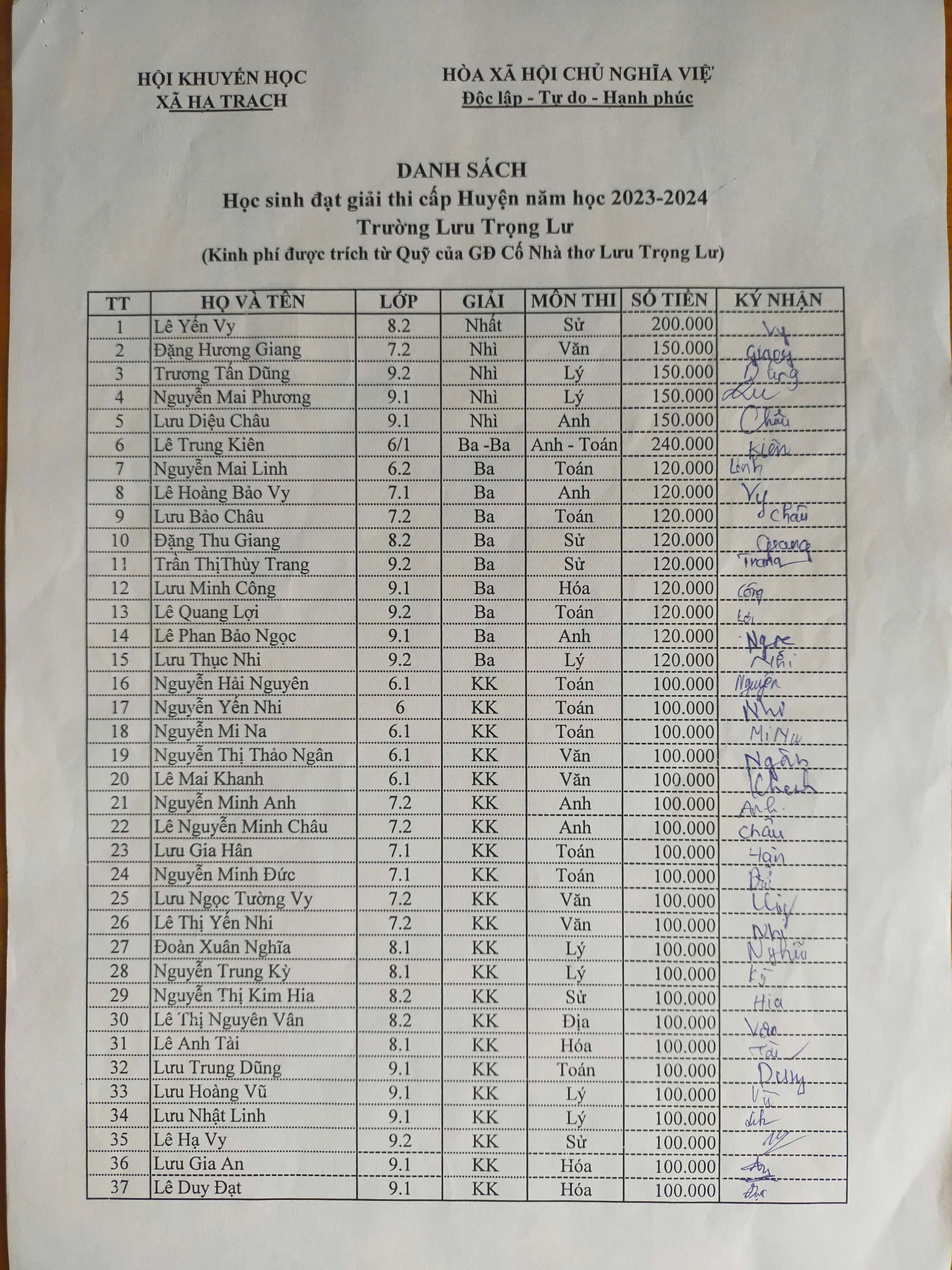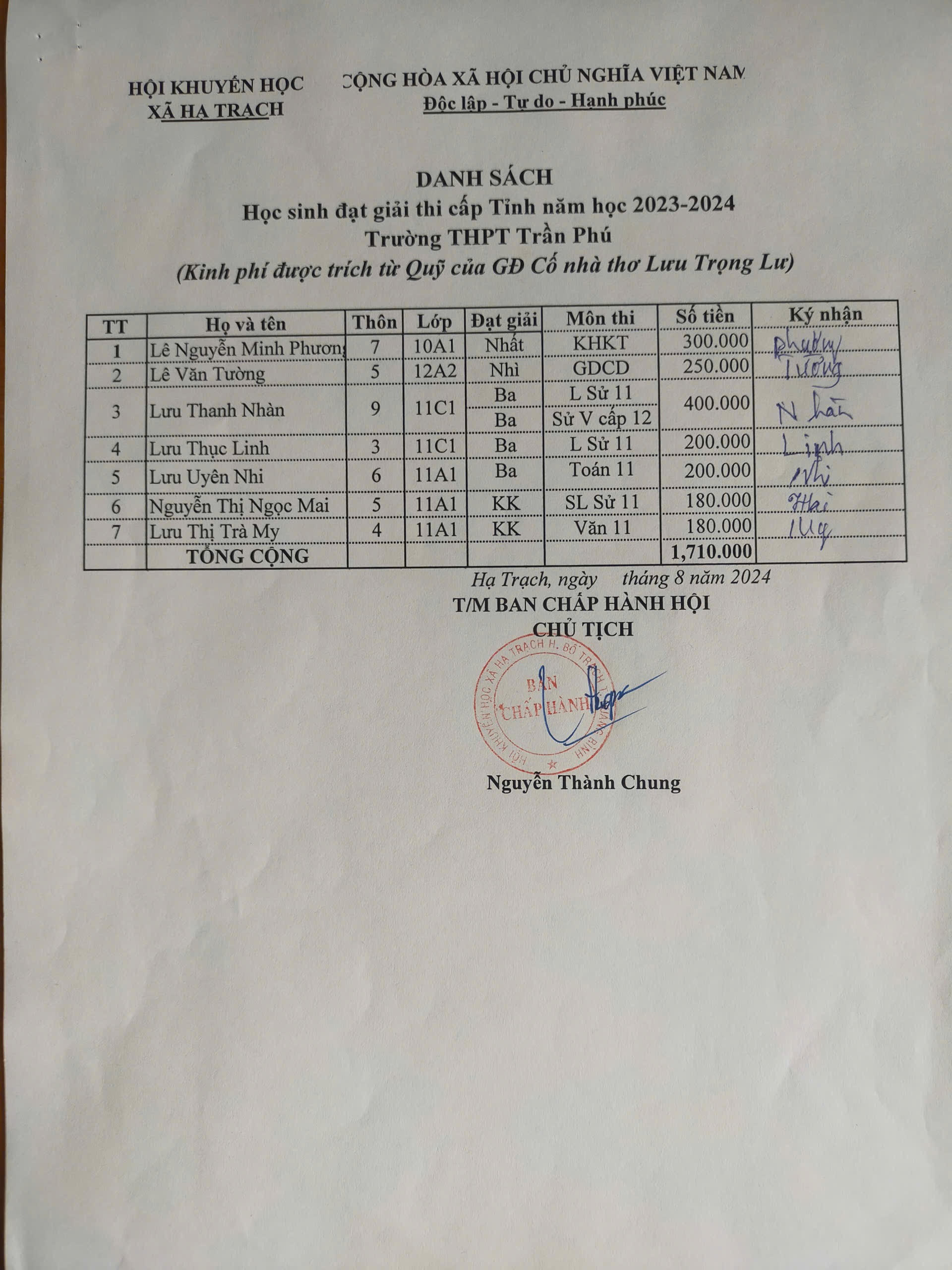 Danh sách các học sinh đạt giải thi các cấp năm học 2023 - 2024 được quỹ Lưu Trọng Lư khen thưởng02:25 - 20/09/2024 Quỹ Lưu Trọng Lư khen thưởng cho các học sinh đạt giải trong các kỳ thi học sinh giỏi các cấp năm học 2023 - 2024 Tác giả: Ban biên tậpChia sẻ: