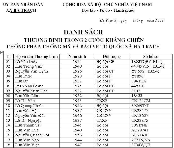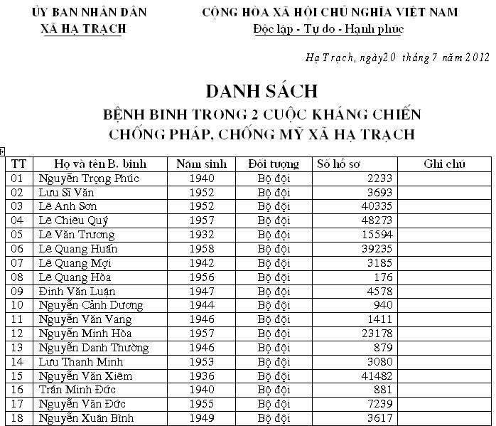 Danh sách các thương binh và bệnh binh xã Hạ Trạch14:08 - 25/07/2012Danh sách các thương binh và bệnh binh Xã Hạ Trạch đến ngày 20 tháng 7 năm 2012 do UBND xã cung cấp . Tác giả: UBND xã Hạ TrạchChia sẻ: