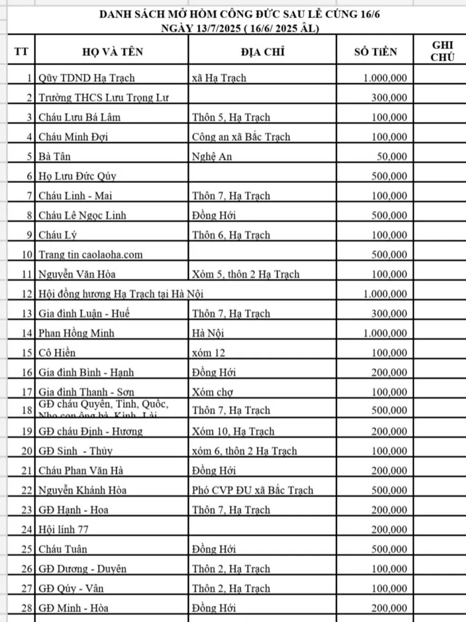 Thay mặt Ban quản lý, Ban cúng tế trân trọng cảm ơn các đồng chí lãnh đạo Đảng, Chính quyền, Mặt trận, đoàn thể xã Bắc Trạch, các cơ quan, đơn vị, doanh nghiệp, các đồng chí Bí thư, Trưởng thôn trên địa bàn, các ông Trưởng họ và đại diện 25 dòng họ làng Cao Lao Hạ, Ban Liên lạc các hội đồng hương, bà con xa quê cùng bà con nhân dân tại quê nhà đã đến dự lễ, dâng hương, cúng mâm cỗ, lễ vật…