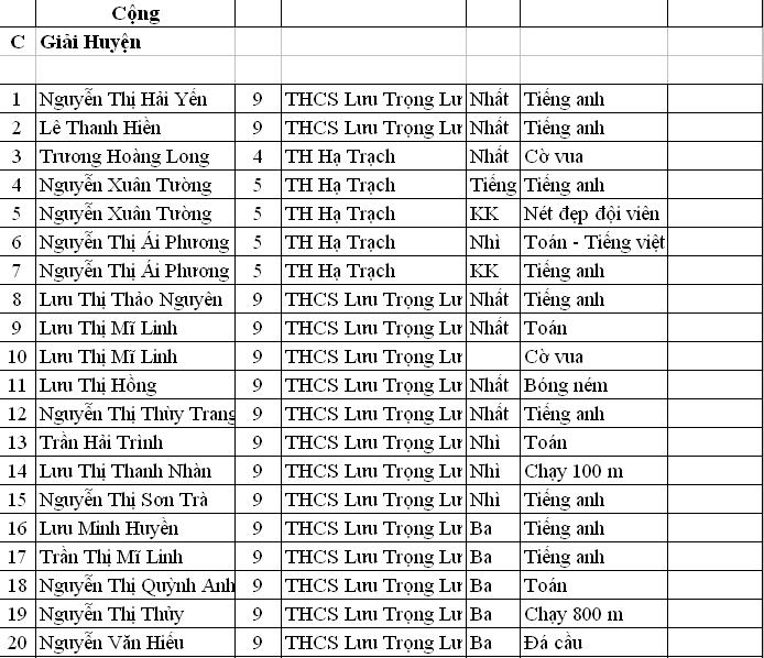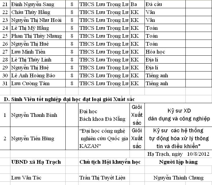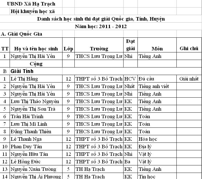 Danh sách học sinh đạt giải quốc gia, tỉnh, huyện năm 201207:10 - 20/09/2012Danh sách học sinh các cấp của xã Hạ Trạch đạt các giải quốc gia,tỉnh,huyện năm học 2011-2012 . Tác giả: Hội khuyến học xãChia sẻ: