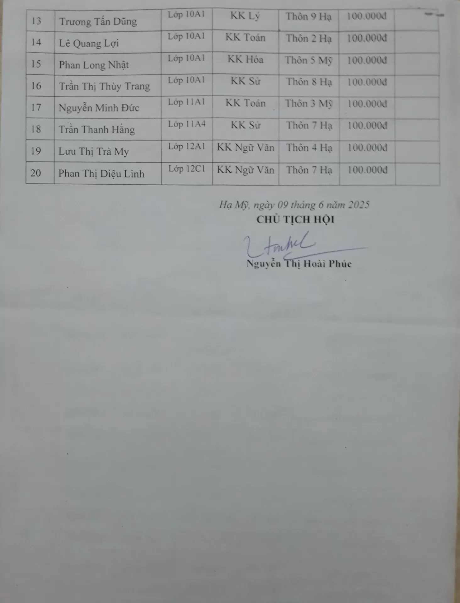 Trong năm học 2024 – 2025, quỹ đã dành 15 triệu, trong đó 10 triệu ủy quyền cho trường THCS Lưu Trọng Lư trao tặng; 5 triệu ủy quyền cho Hội cựu giáo chức xã Hạ Mỹ trao tặng.