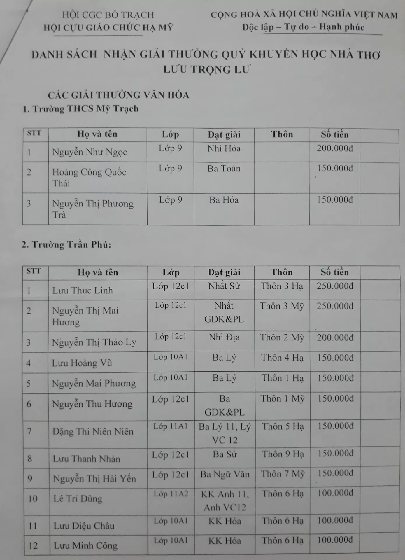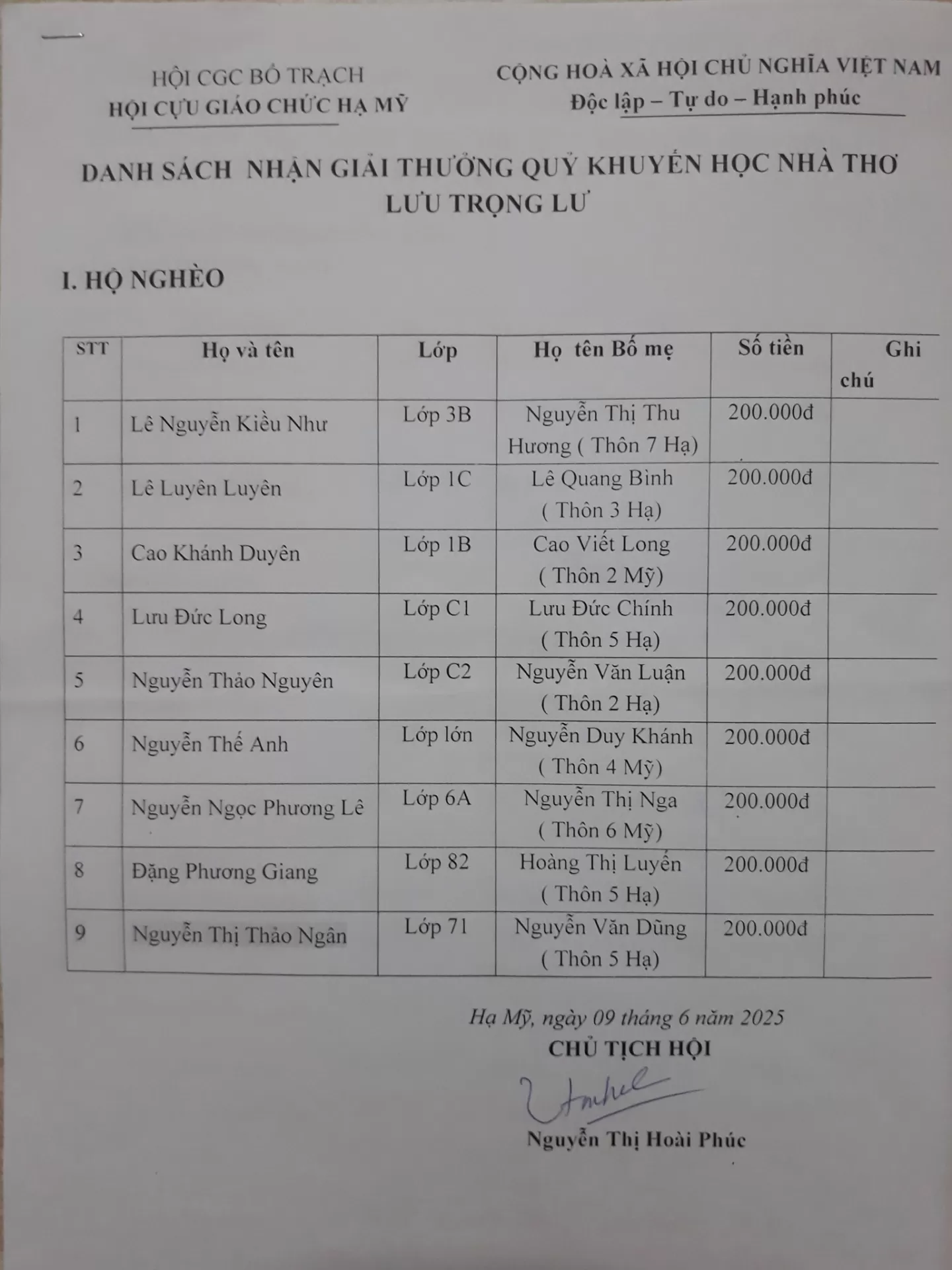 Dưới đây là danh sách các học sinh được nhận phần thưởng của quỹ Lưu Trọng Lư năm học 2024 -2025 tại lễ tuyên dương, trao thưởng giáo viên và học sinh đạt thành tích xuất sắc ngày 12/6/2025 do Hội Cựu giáo chức xã Hạ Mỹ trao tặng