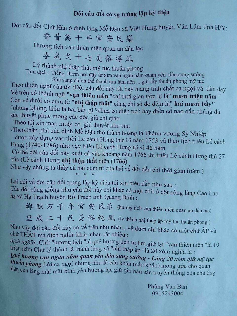 Lời Ban biên tập: Tình cờ đọc được những câu đối ở Đình làng Cao Lao Hạ trên trang tin caolaoha.com, bác Phùng Văn Ban, Trưởng ban quản lý Đình Minh Khai, thôn Minh Khai, Như Quỳnh, Văn Lâm, Hưng Yên đã phát hiện ra sự trùng lặp kỳ diệu giữa câu đối ở Đình làng Cao Lao Hạ với câu đối ở Đình làng Mễ Đậu, Việt Hưng, Văn Giang, Hưng Yên. Bác Phùng Văn Ban đã có bài viết về sự trùng lặp trên và sau đó đã trực tiếp về làng Cao Lao Hạ để tìm hiều thêm thông tin.
