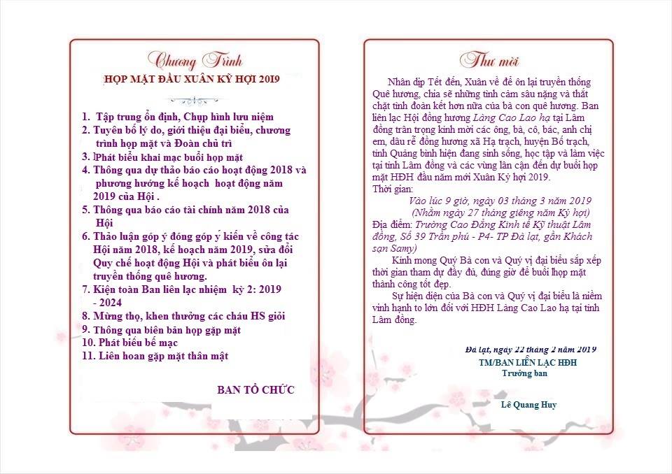 Thông báo mời họp mặt đầu năm mới  Kỷ Hợi 2019 của Hội đồng hương làng Cao Lao Hạ tại Lâm Đồng.