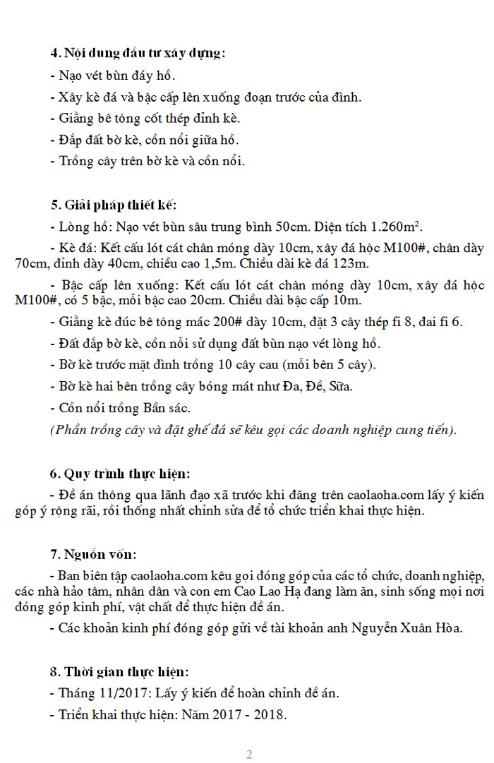 Ngày 28/10/2017, tại lễ kỷ niệm 7 năm thành lập, Ban biên tập trang tin caolaoha.com đã trình bày với các cấp lãnh đạo xã, các cụ Trưởng các họ tộc và các đại biểu tham dự về ý tưởng kè hồ trước Đình làng, đồng thời xin phép được triển khai sớm để kịp hoàn thành trước ngày cúng Thành Hoàng năm 2018.