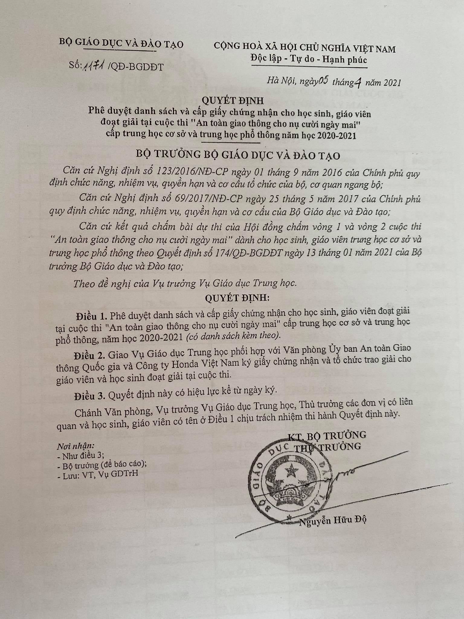 Bộ giáo dục khen thưởng em Lưu Thị Tố Nga học sinh trường THCS Lưu Trọng Lư đạt giải khuyến khích cuộc thi “An toàn giao thông cho nụ cười ngày mai”