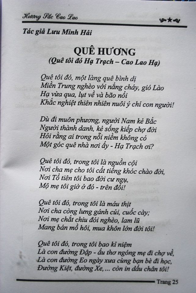 Cao Lao, Hạ Trạch quê mình. Bốn bề phong cảnh hữu tình nước non. Cao Lao tiền thế đặt tên. Cao trông vời vợi, Lao bền không xiêu