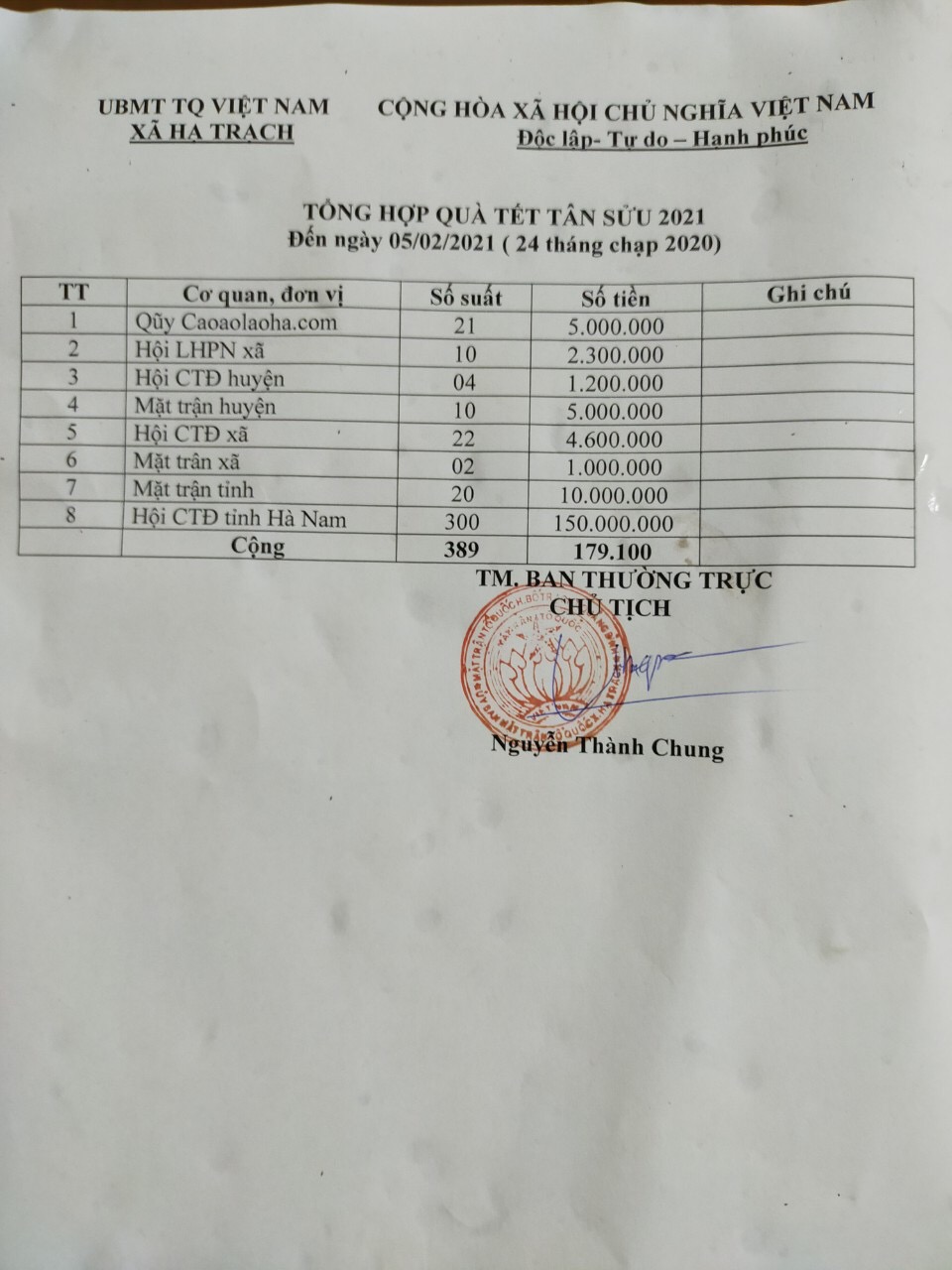 Năm nay, Tân Sửu 2021, có 8 đơn vị trong cả nước tặng quà cho bà con nghèo Hạ Trạch với tổng số tiền là 179 triệu đồng