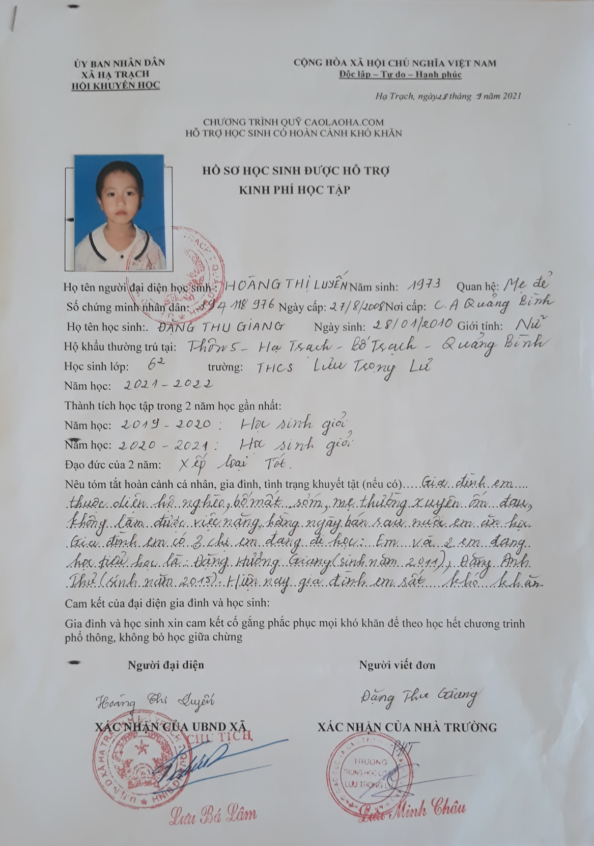 1. Cháu Đặng Thu Giang, học sinh lớp 62 trường THCS Lưu Trọng Lư là con chị Hoàng Thị Luyến, Thôn 5. Gia đình chị Hoàng thị Luyến là hộ nghèo.