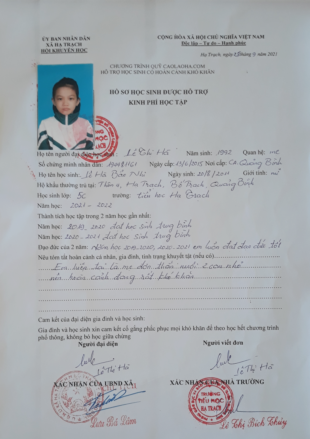 Dưới đây là danh sách 5 cháu được quỹ caolaoha.com hỗ trợ do UBMTTQ Việt Nam xã Hạ Trạch kết hợp cùng các trường THCS Lưu Trọng Lư và tiểu học Hạ Trạch lựa chọn:
