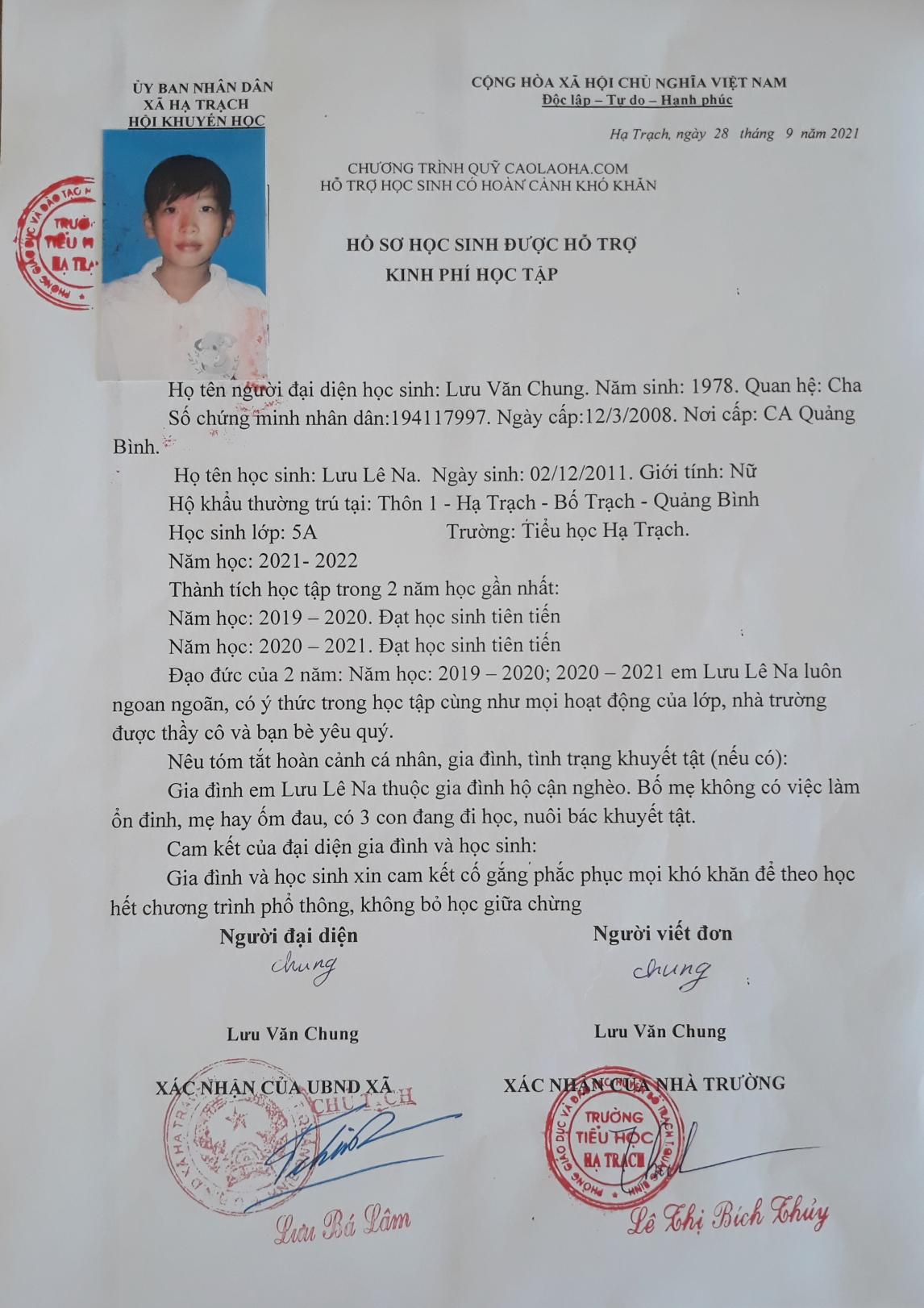 4. Cháu Lưu Lê Na, học sinh lớp 5A, trường Tiểu học Hạ Trạch là con anh Lưu Văn Chung, Thôn 1. Gia đình anh Lưu Văn Chung là hộ cận nghèo.