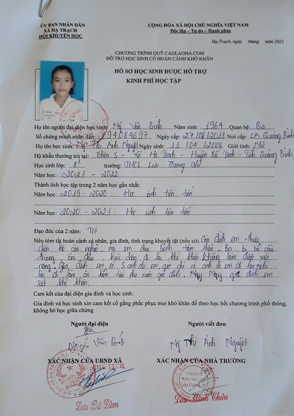 - 5 cháu học sinh là con các hộ nghèo và cận nghèo có quyết tâm vươn lên trong học tập và tu dưỡng đạo đức; được gia đình cam đoan tạo điều kiện cho học tập; do UBND xã kết hợp với các trường THCS Lưu Trọng Lư và tiểu học Hạ Trạch lựa chọn sẽ được trang tin caolaoha.com hỗ trợ mỗi tháng mỗi cháu là 250.000đ (hai trăm năm mươi ngàn đồng)