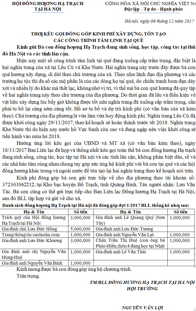 Lời Ban biên tập: Ngày 22/11/2017, Ban chấp hành Hội Đồng hương Hạ Trạch tại Hà Nội đã họp tại nhà anh Nguyễn Danh Lợi để bàn về phương thức và kế hoạch hưởng ứng lời kêu gọi của quê hương về việc xây dựng, nâng cấp nghĩa địa Lều Cù và Khe Nước. Tham gia cuộc họp có các anh Nguyễn Danh Lợi, Nguyễn Văn Hùng, Nguyễn Văn Bính, Lưu Đức Hải, Lưu Đức Tương, Lê Văn Thái, Nguyễn Văn Trung, Nguyễn Thị Hương. Sau khi thảo luận, Ban chấp hành đã nhất trí là sẽ rà soát lại toàn bộ danh sách đồng hương Hạ Trạch tại Hà Nội và vùng lân cận sau đó sẽ và gửi đến từng gia đình qua đường bưu điện thư kêu gọi của xã và thư của Hội đồng hương; đồng thời các thành viên Ban chấp hàng phụ trách các khu vực sẽ liên hệ với từng gia đình đồng hương bằng điện thoại và gặp trực tiếp nếu có thể để phổ biến thêm về nội dung thư kêu gọi của xã.