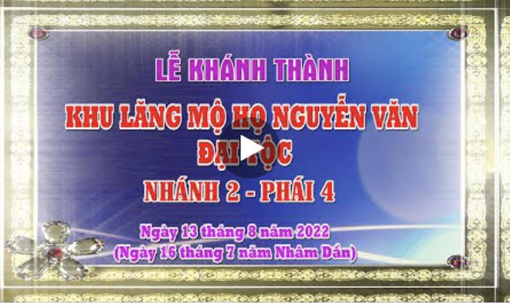 Khánh thành khu lăng mộ họ Nguyễn Văn đại tộc02:47 - 22/08/2022 Video lễ khánh thành khu lăng mộ họ Nguyễn Văn Đại tộc nhánh 2 phái 4 Chia sẻ: