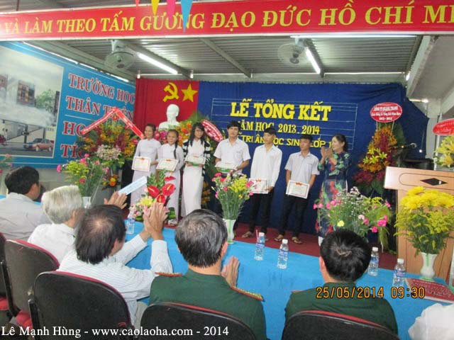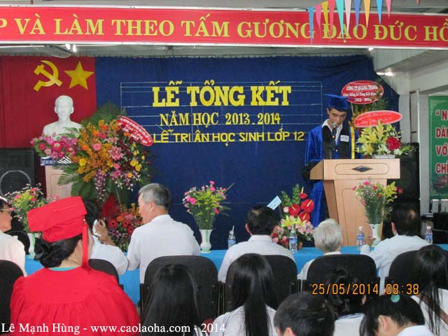 Sau chương trình biểu diễn văn nghệ chào mừng và nghi thức chào cờ, Thầy Lưu Văn Thắng Hiệu trưởng trường đã thông báo tại buổi lễ tổng kết năm học 2013 – 2014 đạt được nhiều thành tích tốt đẹp về mọi mặt. Đó là thành tích nổi bật trong công tác bồi dưỡng học sinh giỏi, chăm lo và rèn luyện cho các em. Có được những thắng lợi là nhờ sự tâm huyết say mê của đội ngũ cán bộ, giáo viên, sự cố gắng nỗ lực của học sinh và sự phối hợp chặt chẽ của Hội Phụ hunh học sinh. Lễ tri ân học sinh lớp 12, thầy Hiệu trưởng đã gửi gắm những nỗi niềm xúc động khi nói lời chia tay với học sinh khối 12, hy vọng các em sẽ đạt kết quả tốt nhất trong kỳ thi tốt nghiệp và đại học…