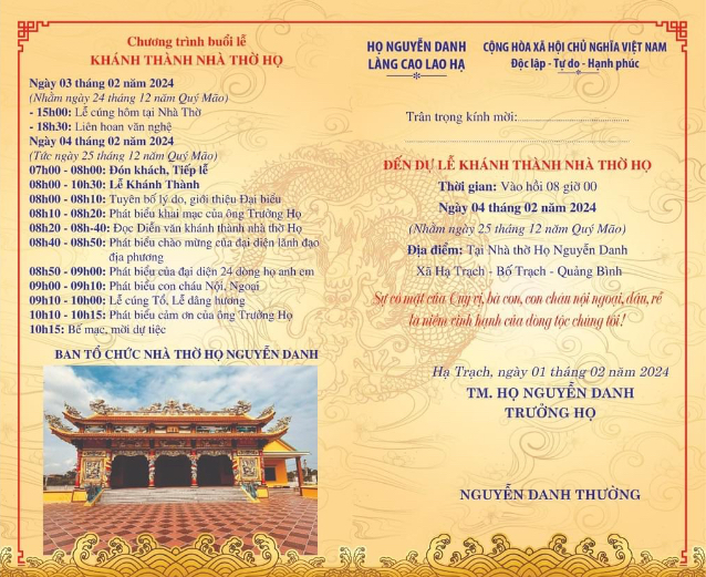 Mời dự lễ khánh thành nhà thờ họ Nguyễn Danh