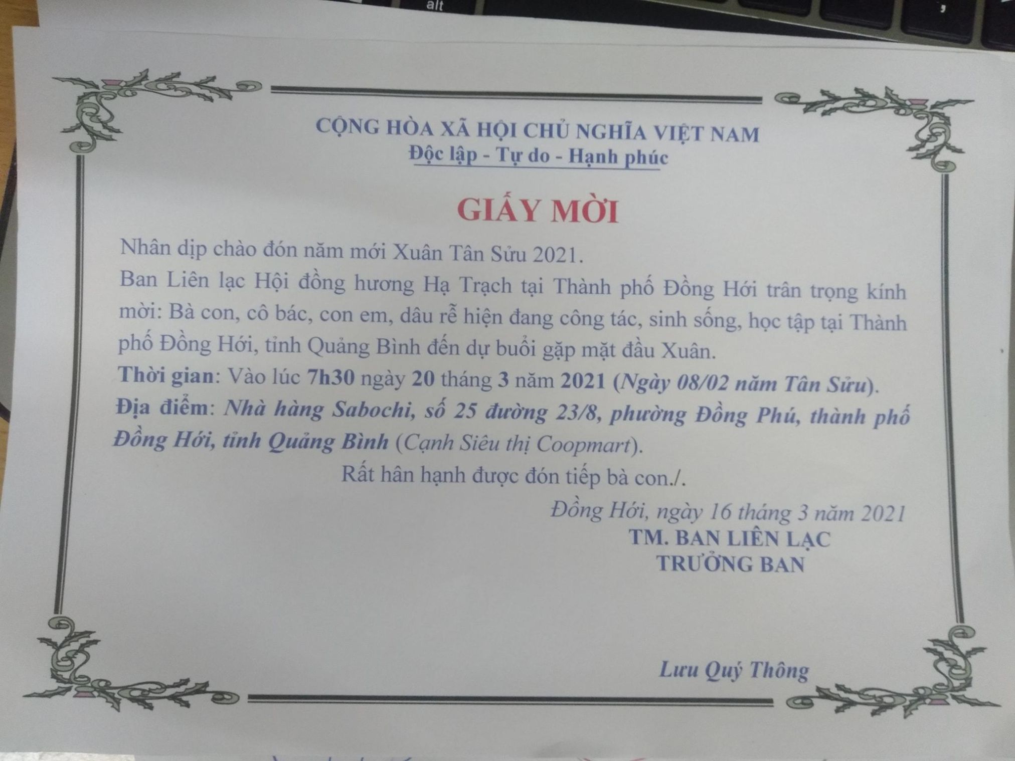 Mời gặp mặt đầu xuân Tân Sửu15:15 - 17/03/2021 Thông báo mời gặp mặt đầu xuân Tân Sửu, 2021 của Hội Đồng hương Hạ Trạch tại Đồng Hới Chia sẻ: