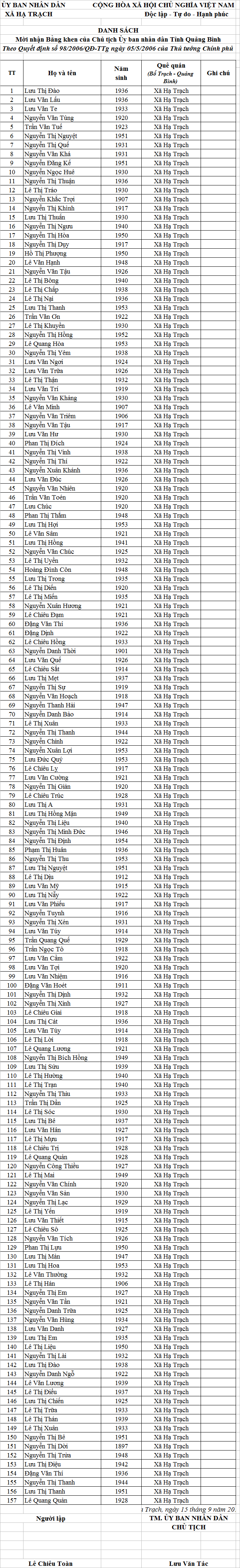 Lời Ban biên tập: Nhân dịp Kỷ niệm 70 năm ngày thành lập nước Cộng hoà xã hội chủ nghĩa Việt Nam, Chủ tịch UBND tỉnh Quảng Bình đã ký Quyết định số 3480/QĐ-KT ngày 14/12/2010 về việc khen thưởng các cá nhân có công với nước. Thực hiện QĐ trên, ngày 26/8/2015, tại hội trường UBND xã Hạ Trạch, Đảng ủy-HĐND-UBND-UBMTTQVN xã HạTrạch đã long trọng tổ chức lễ trao tặng và truy tặng Bằng khen cho những người có công và đại diện gia đình có công với nước của xã Hạ Trạch; thông tin về buôỉ lễ đã được đăng tải trên caolaoha.com ngày 29/8/2015 (xem tại đây). Xin trân trọng giới thiệu với bà con danh sách những người con ưu tú của quê hương Cao Lao Hạ được tặng thưởng dịp này. Bà con và gia đình nào chưa nhận bằng vui lòng đến gặp Đ/c Lê Chiêu Toàn, cán bộ chính sách xã để nhận bằng khen của Chủ tịch.