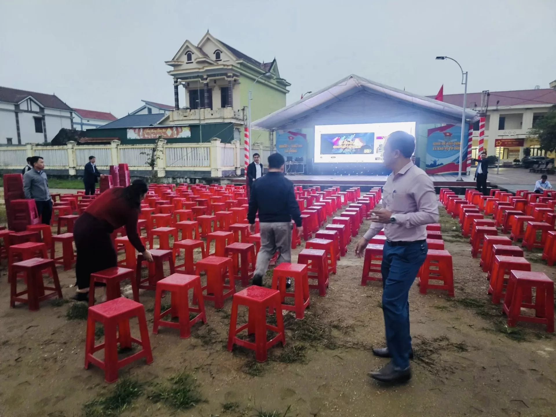 Công chức Xã sắp xếp ghế chuẩn bị cho buổi chiếu phim (Ảnh Facebook của xã)