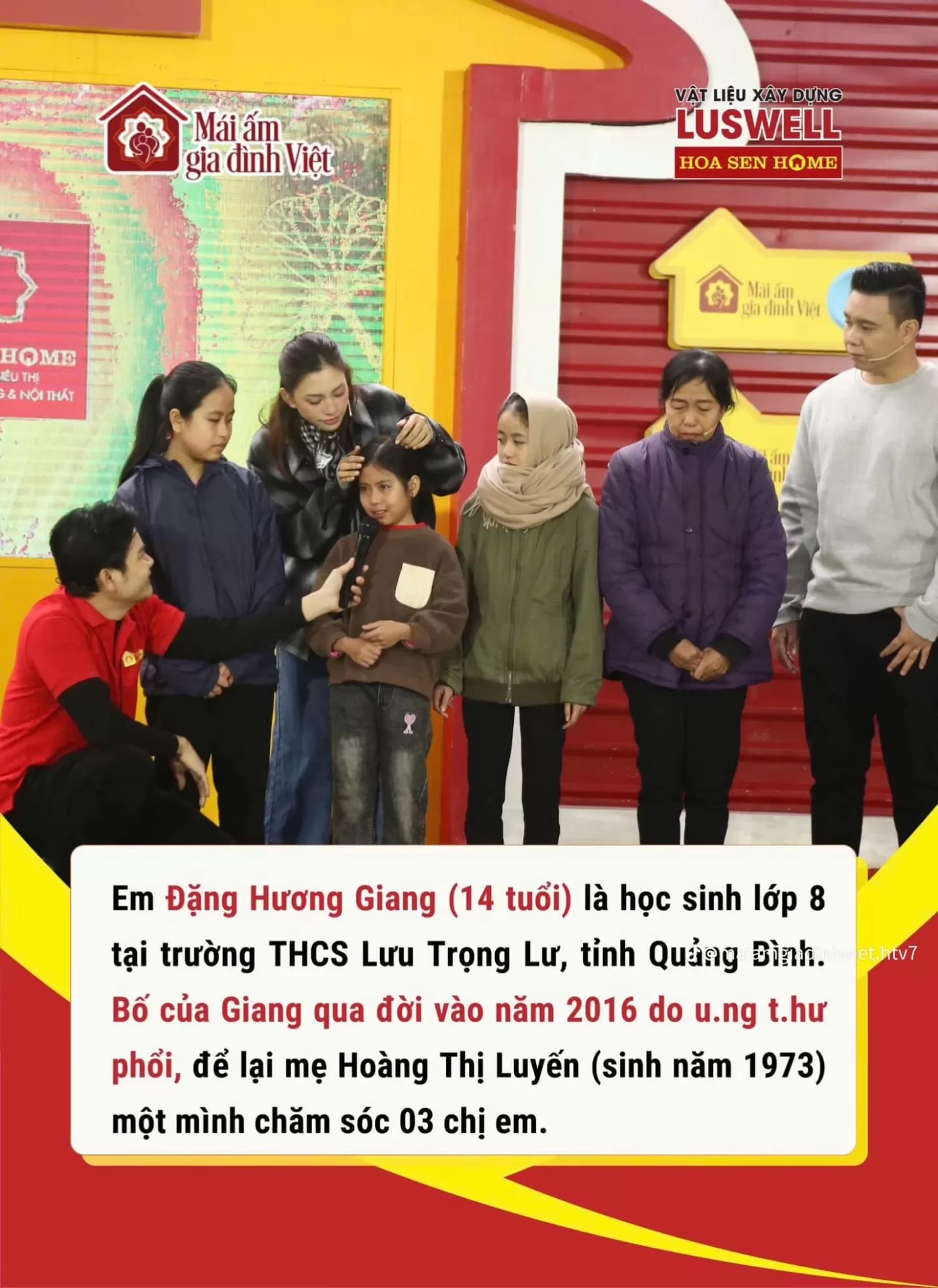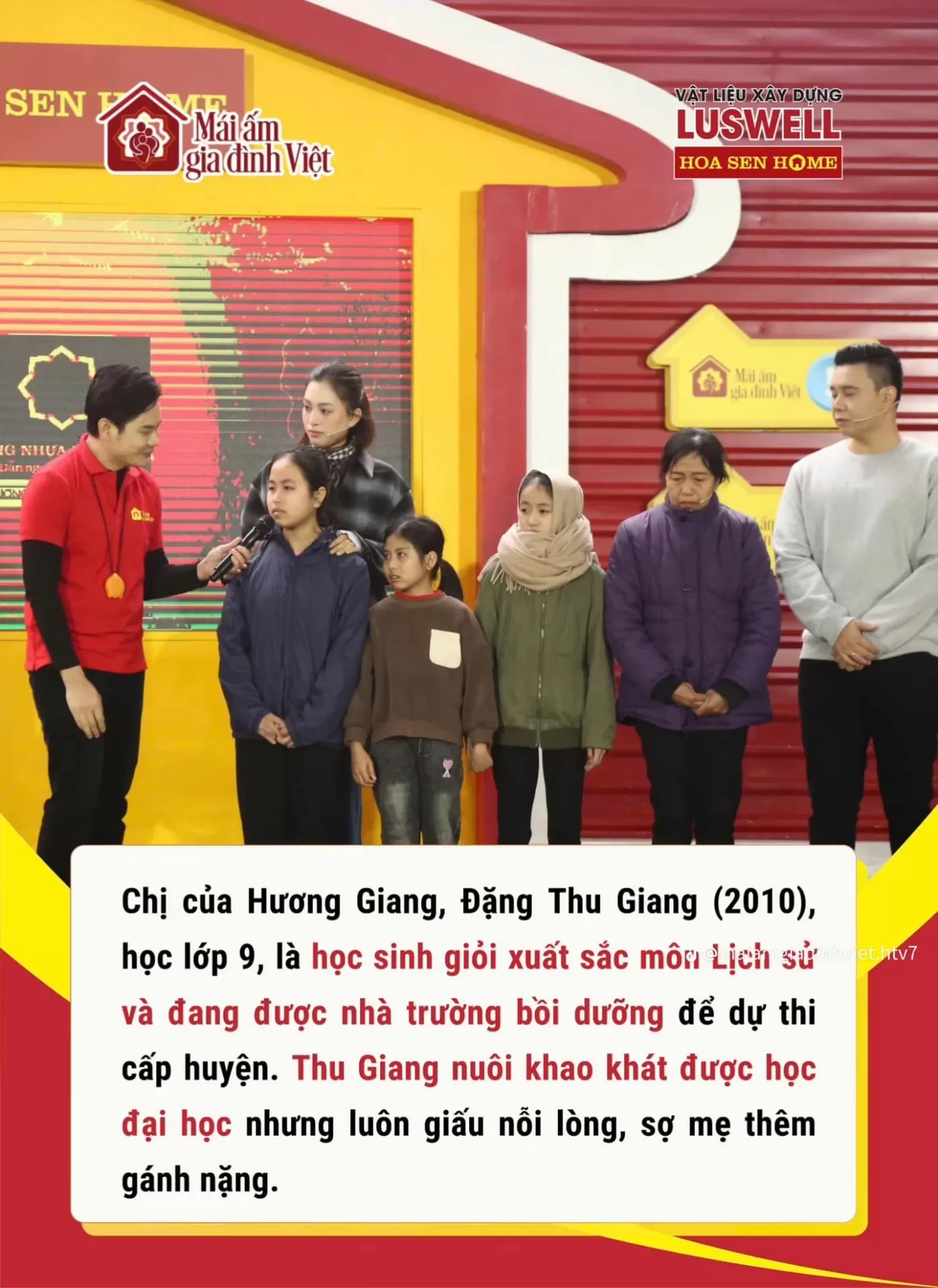 Hai em sinh ra trong gia đình có ba chị em. Bố em mất vì bị bệnh hiểm nghèo, một mình mẹ không có việc làm ổn định, hằng ngày phải đi làm thuê để lo cho 3 chị em ăn học. Mặc dầu nhà nghèo hoàn cảnh nhưng 3 chị em luôn chăm chỉ học tập và đạt thành tích xuất sắc: Đặng Hương Giang 7 năm liền luôn là học sinh giỏi, xuất sắc, đạt giải Nhì và giải Ba cuộc thi học sinh giỏi môn văn cấp Huyện. Em Đặng Thu Giang nhiều năm liền là học sinh giỏi, đạt giải Ba cuộc thi học sinh môn lịch sử cấp Huyện và giải 3 môn lịch sử cấp Tỉnh.