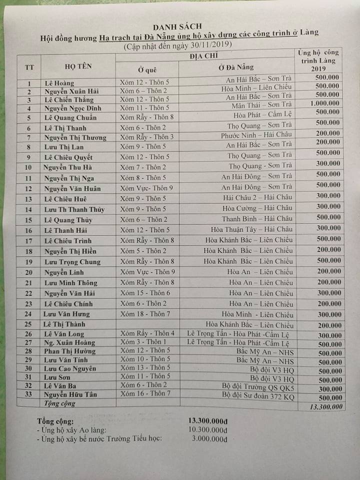 Thay mặt bà con đồng hương Hạ Trạch tại Đà Nẵng, các anh tặng UBND xã bức tranh “Cầu Rồng Đà Nẵng” và 13.300.000đ (mười ba triệu ba trăm ngàn đồng), trong đó có 3.000.000đ (ba triệu) tặng trường Tiểu học Hạ Trạch, số còn lại để tôn tạo ao Đình.
