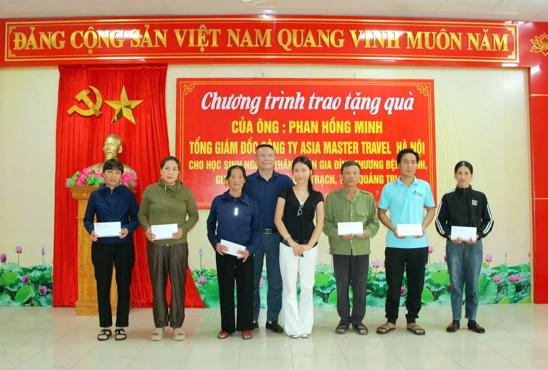 Hướng tới kỷ niệm 78 năm ngày Thương binh – Liệt sỹ (27/7/1947 – 27/7/2025, với tấm lòng tri ân các anh hùng liệt sỹ, các thương binh, bệnh binh, người có công với cách mạng - những người đã cống hiến, hy sinh vì độc lập, tự do của Tổ quốc. Ngày 09/7/2025, Tiến sĩ Phan Hồng Minh – Tổng Giám đốc Công ty TNHH Đầu tư và Du lịch lữ hành ASIA MASTRER TRAVEL HÀ NỘI cùng con gái đã trở về quê hương thăm, tặng quà các thương binh, bệnh binh, người có công với cách mạng có hoàn cảnh khó khăn trên địa bàn xã Bắc Trạch (mới). Tổng số 30 suất quà, mỗi suất 1.000.000 đồng (một triệu đồng).