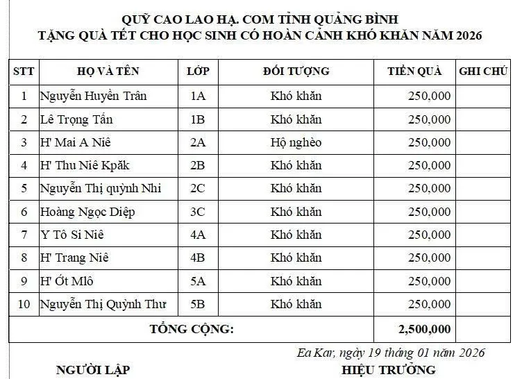 Hiệu trưởng trường là thầy giáo Lê Văn Dục, người làng Cao Lao Hạ quê mình. Thầy là người gắn bó rất sâu nặng với nhà trường, với các em học sinh. Cảm phục tấm lòng của Thầy đối với sự nghiệp giáo dục vùng núi Tây Nguyên, trang tin caolaoha.com đã gửi tặng 10 suất quà mỗi suất 250 ngàn đồng cho các học sinh nghèo của trường đón tết Bính Ngọ 2026.