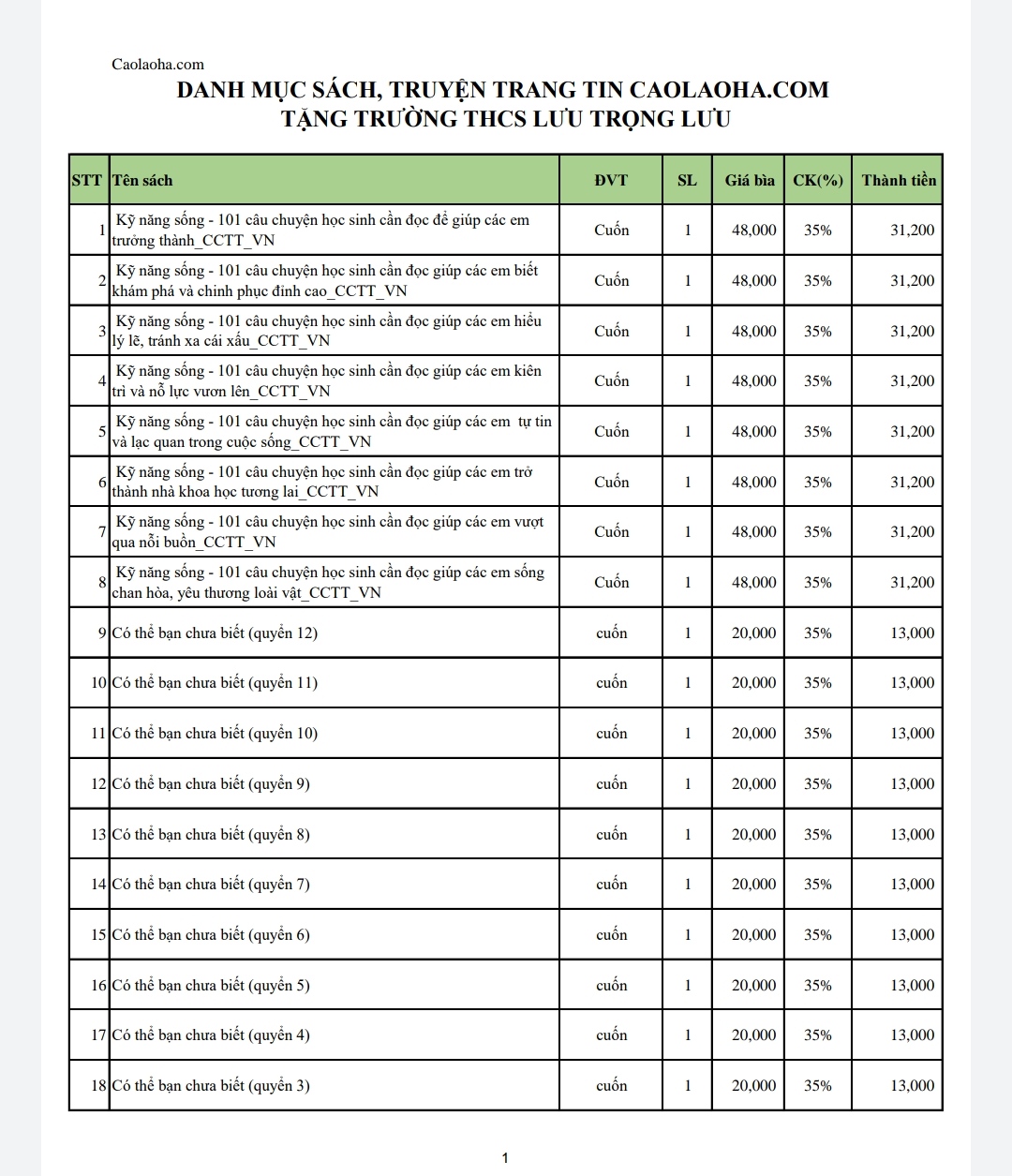 Qua trao đổi với thầy Lưu Trọng Hoành, Hiệu trưởng trường THCS Lưu Trọng Lư; được sự tham vấn của một số chuyên gia giáo dục THCS ở Hà Nội, trang tin caolaoha.com đã chọn lọc và gửi tặng trường THCS Lưu Trọng Lư, xã Hạ Trạch, huyện Bố Trạch, tỉnh Quảng Bình 171 đầu sách giáo dục, truyện, sách kỹ năng trị giá hơn 5 triệu đồng (giá đã được chiết khấu).