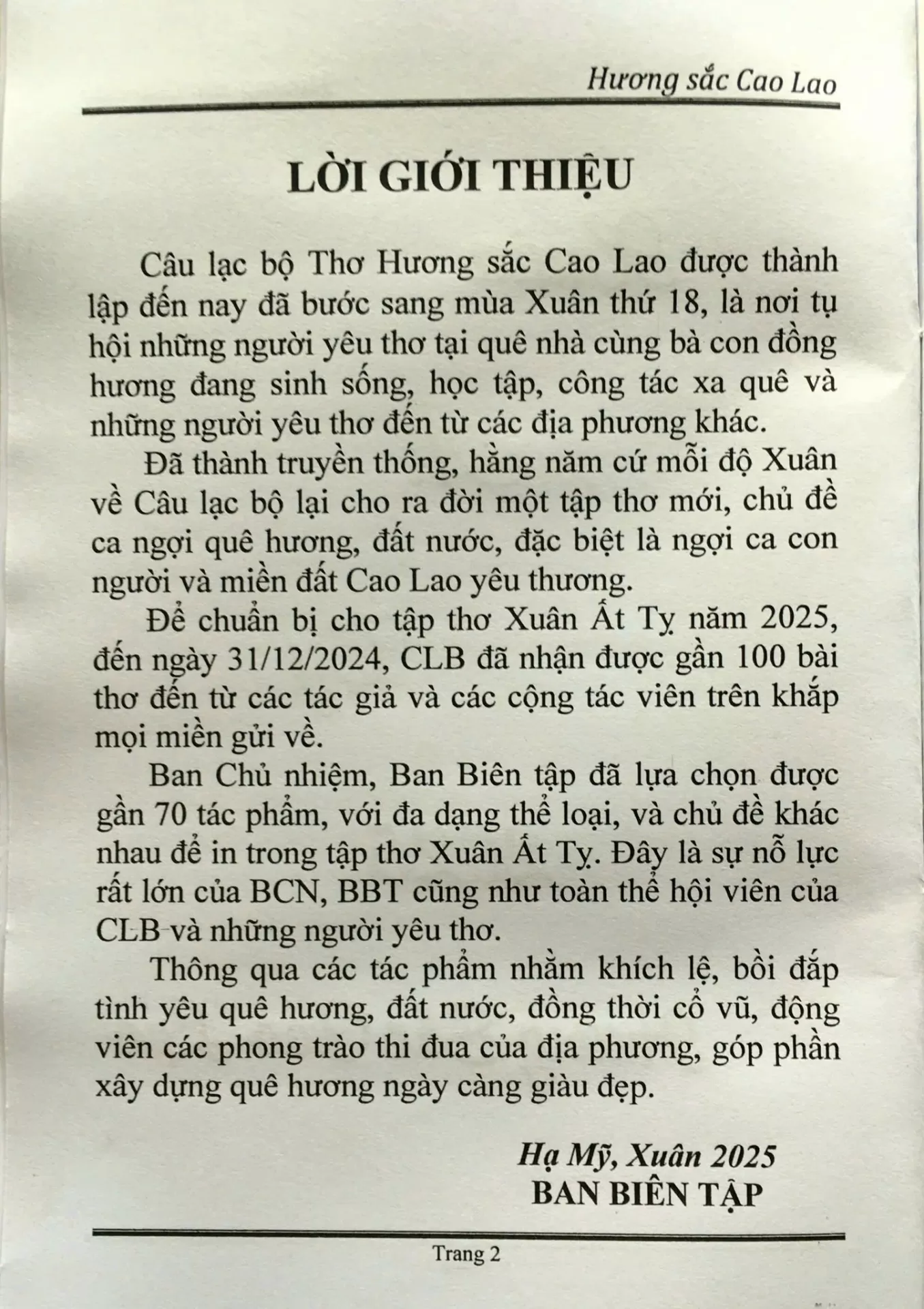 Tập thơ Hương sắc Cao Lao xuân Ất Tỵ 202514:21 - 30/01/2025 Câu lạc Hương Sắc Cao Lao ra mắt tập thơ Hương sắc Cao Lao xuân Ất tỵ 2025 Tác giả: Nguyễn Chung QuýChia sẻ: