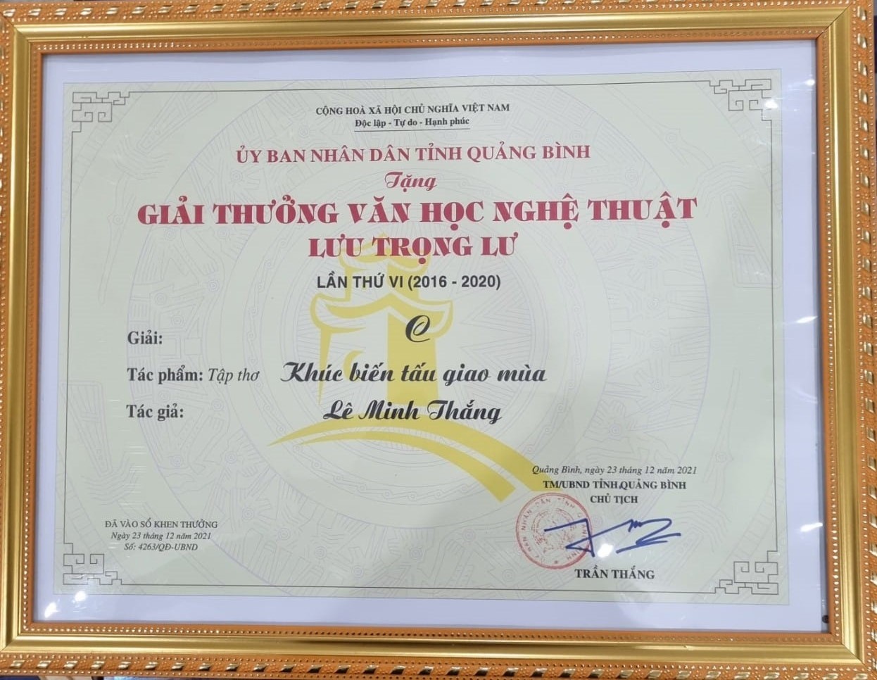 Ngày 23/12/2021, UBND tỉnh đã ban hành Quyết định số 4263/QĐ-UBND về việc công nhận Giải thưởng Văn học Nghệ thuật Lưu Trọng Lư cho các tác phẩm của hội viên Hội Văn học Nghệ thuật tỉnh Quảng Bình lần thứ VI (2016 - 2020).