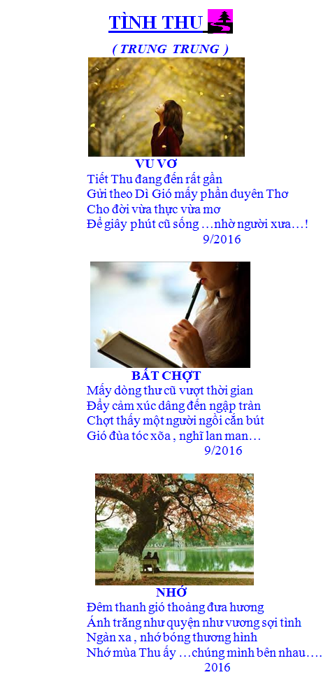 Lời Ban Biên tập: Trung Trung là một nhà thơ người làng Cao Lao Hạ, hiện đang sống ở thành phố Hồ Chí Minh. Anh xuất hiện nhiều qua các comments bình luận về câu đối Đình làng về văn thơ chữ Hán, thơ Đường trước đây trên caolaoha.com. Caolaoha.com đã đăng chùm thơ "Thơ gửi cố nhân 1" (xem tại đây http://caolaoha.com/?language=vi&nv=news&op=Khoa-tang-sang-tac/Tho-gui-co-nhan-2050 ). Nay, xin giới thiệu tiếp chùm "Thơ gửi cố nhân 2" của anh.