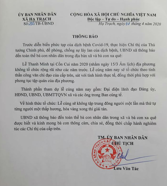 Thông báo của UBND xã Hạ Trạch về lễ cúng Cồn Cui năm 2020