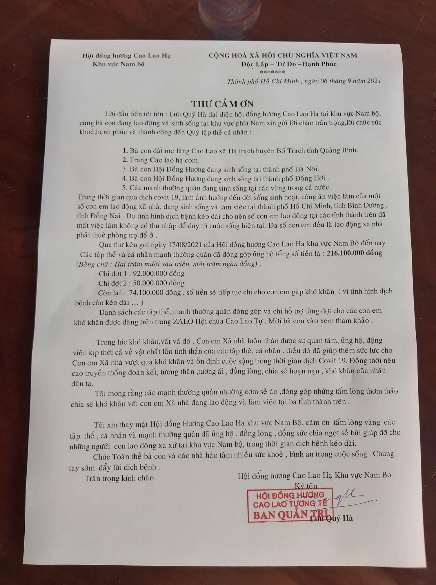Thư cám ơn của Hội đồng hương Hạ Trạch tại Tp. Hồ Chí Minh và khu vực Nam Bộ
