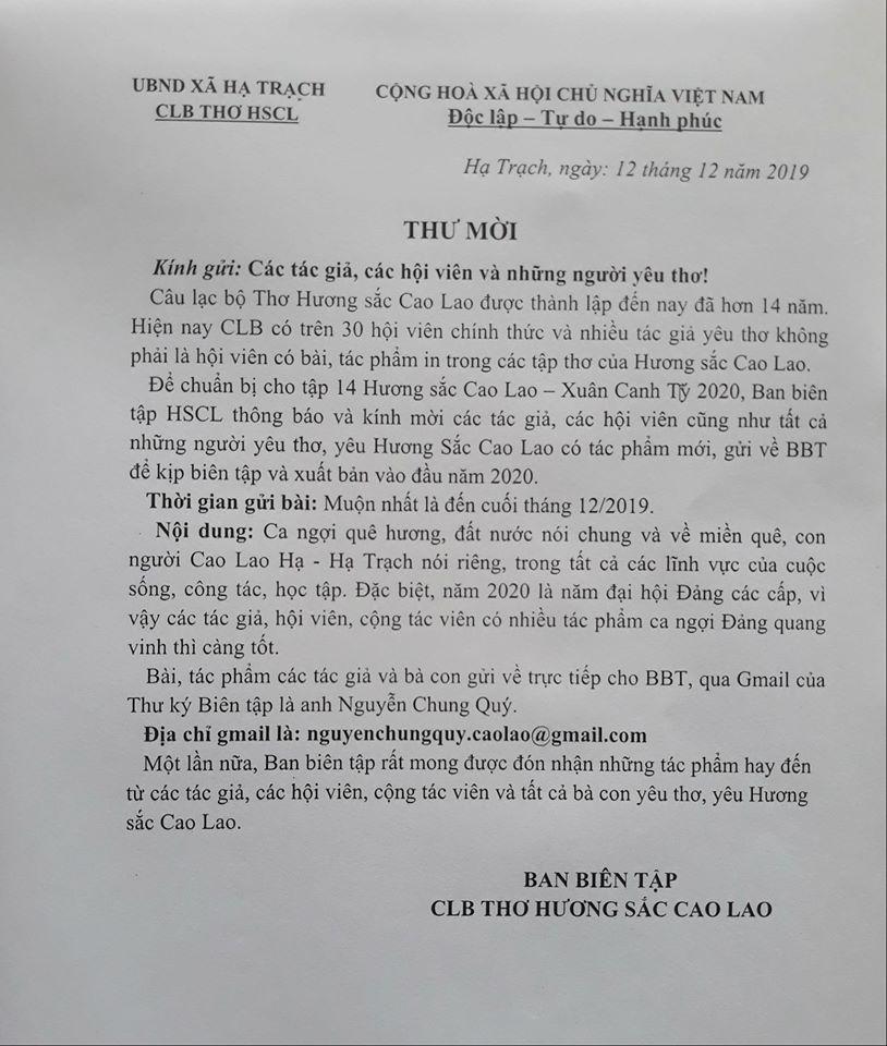 Thư của Câu lạc bộ thơ Hương Sắc Cao Lao