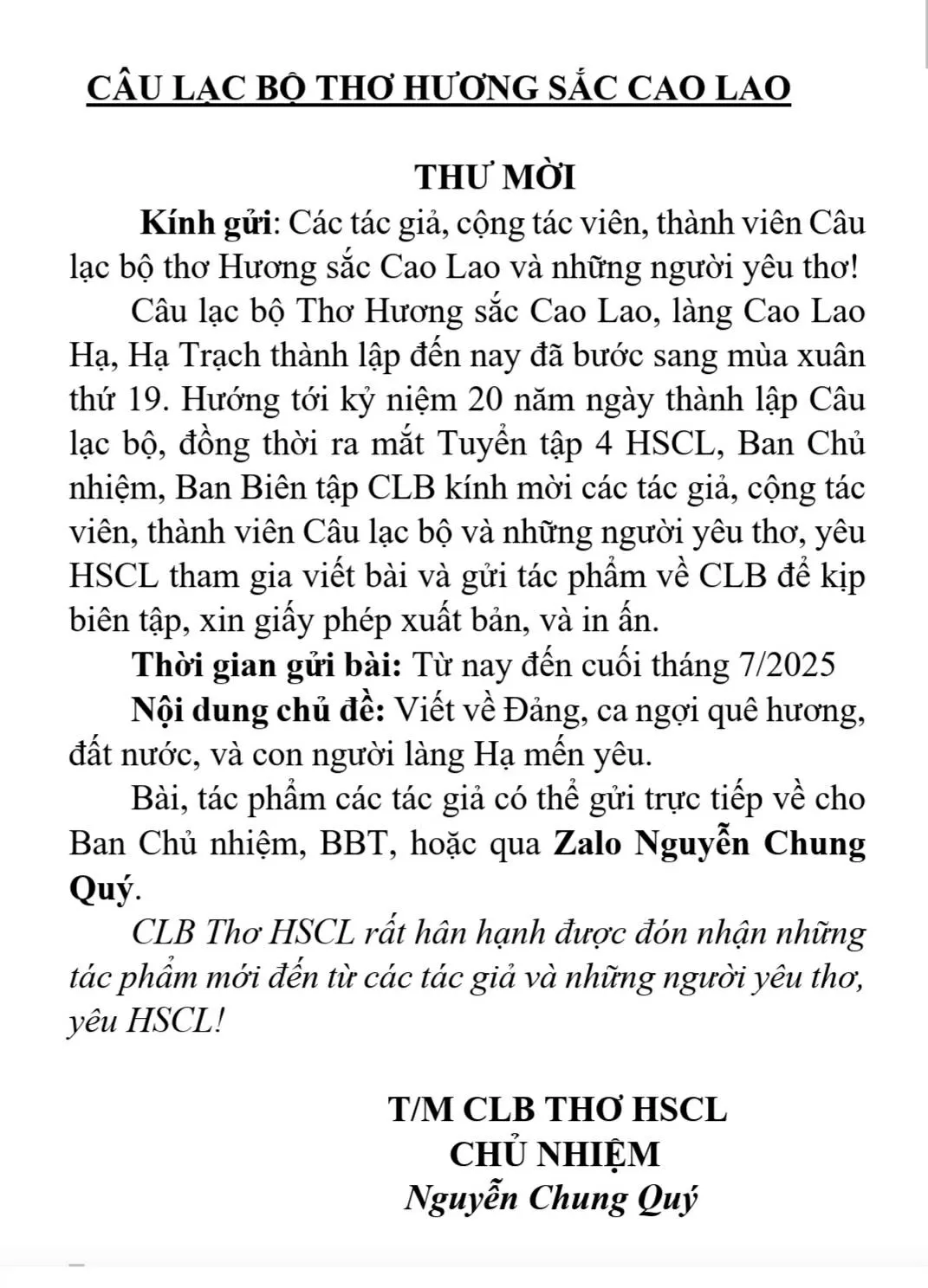 Thư của Câu lạc bộ thơ Hương sắc Cao Lao16:23 - 05/05/2025 Câu lạc bộ thơ Hương sắc Cao Lao mời gửi bài tham gia tuyển tập thơ năm 2025 của làng Cao Lao Hạ Tác giả: Nguyễn Chung QuýChia sẻ: