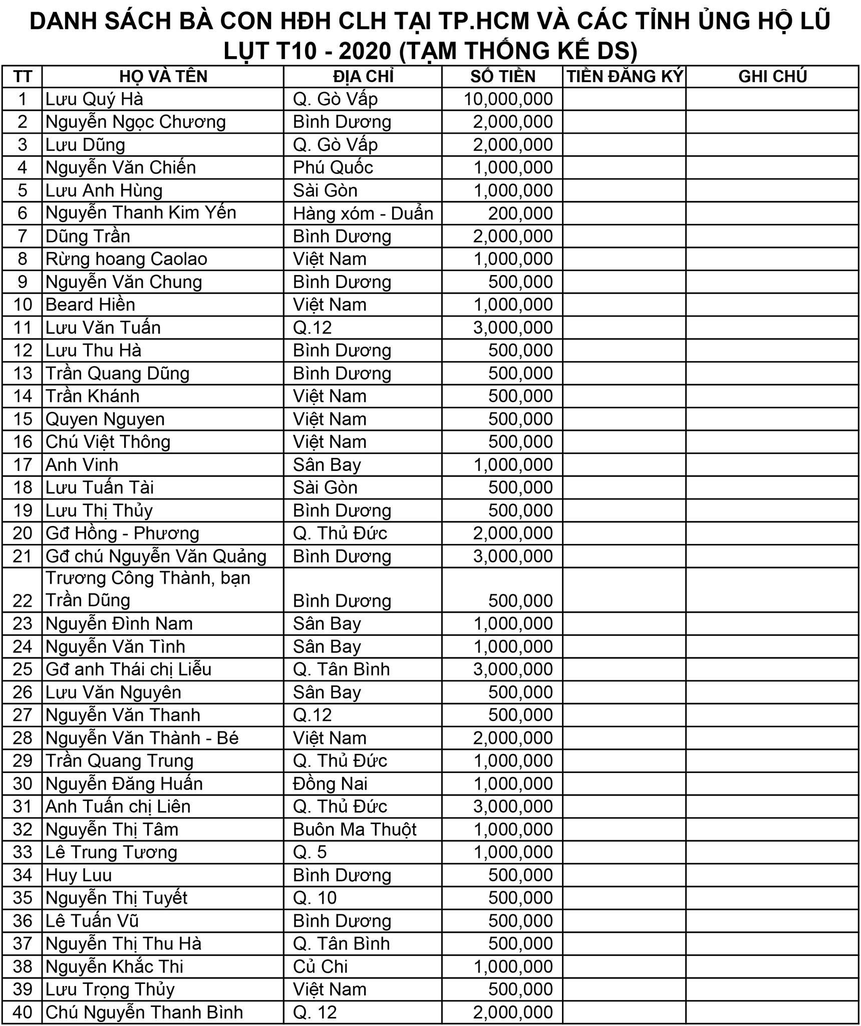- Anh Nguyễn Phước Đức, Tp. HCM, bạn anh Lưu Đức Khương: 20.000.000 (hai mươi triệu)